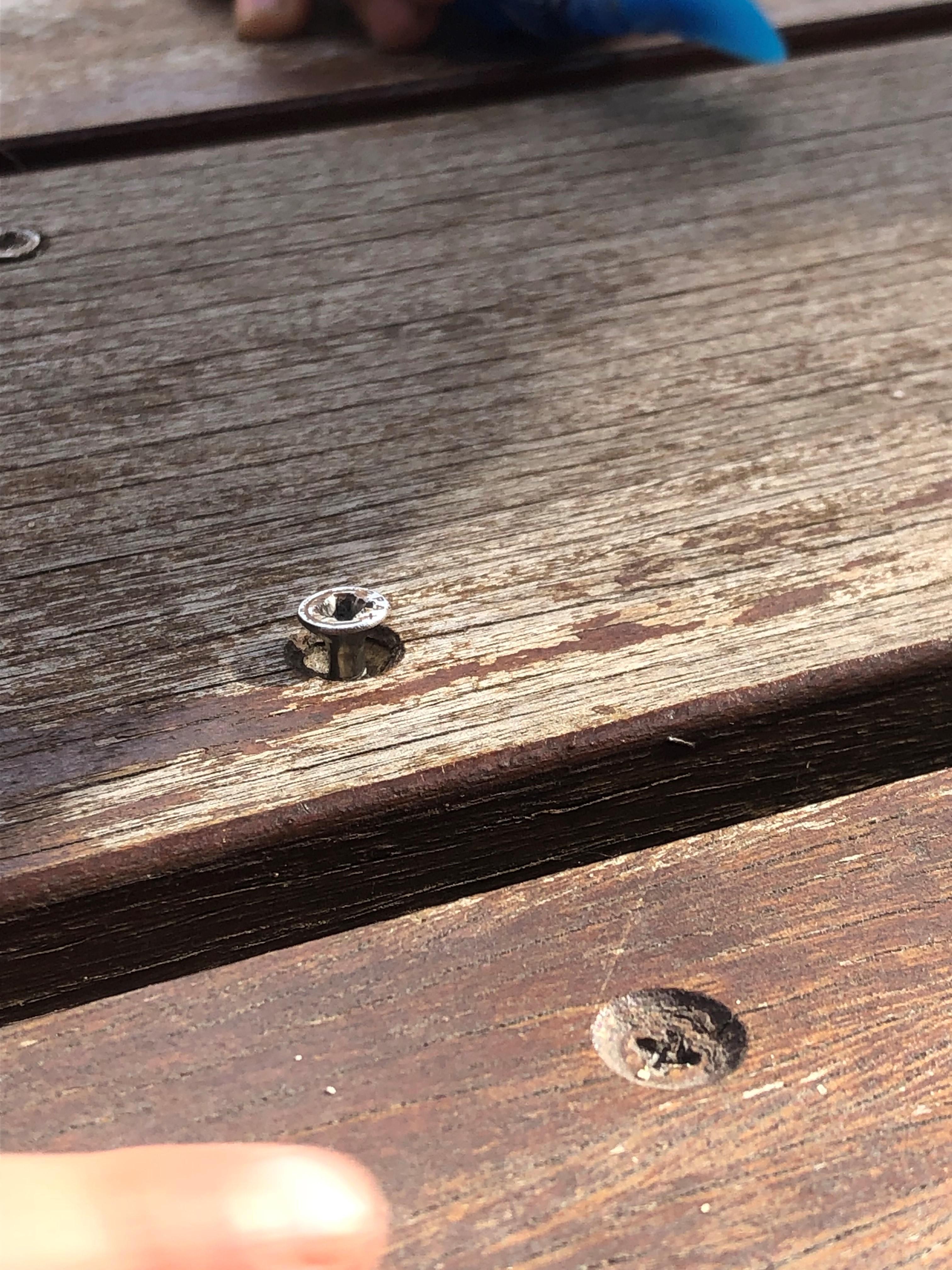 S'ha reparat el cargol i s'ha fet el manteniment de pintura de tota la base de fusta de la bancada. Avisem al servei de neteja perquè revisi neteja entre peces de fusta.