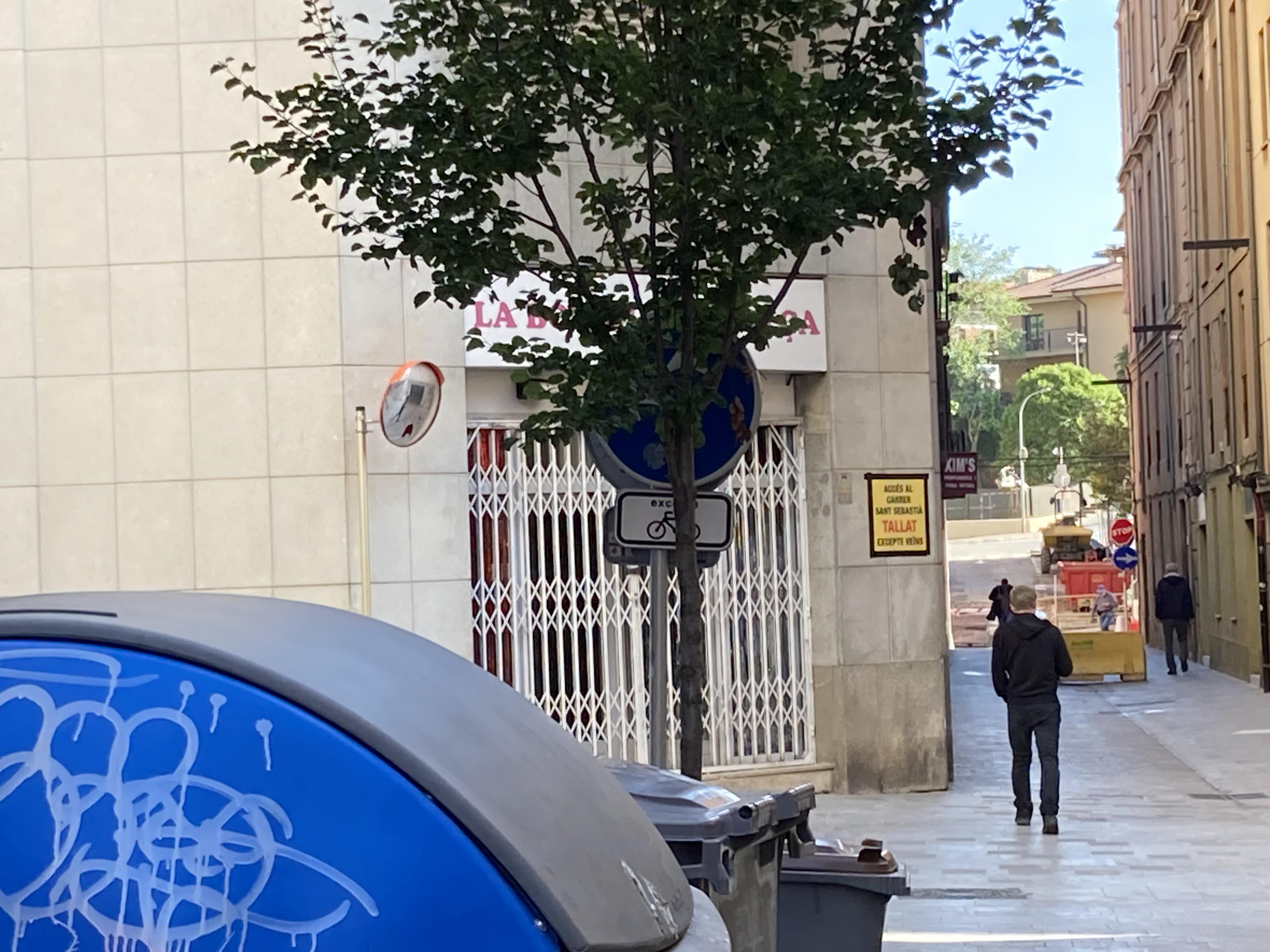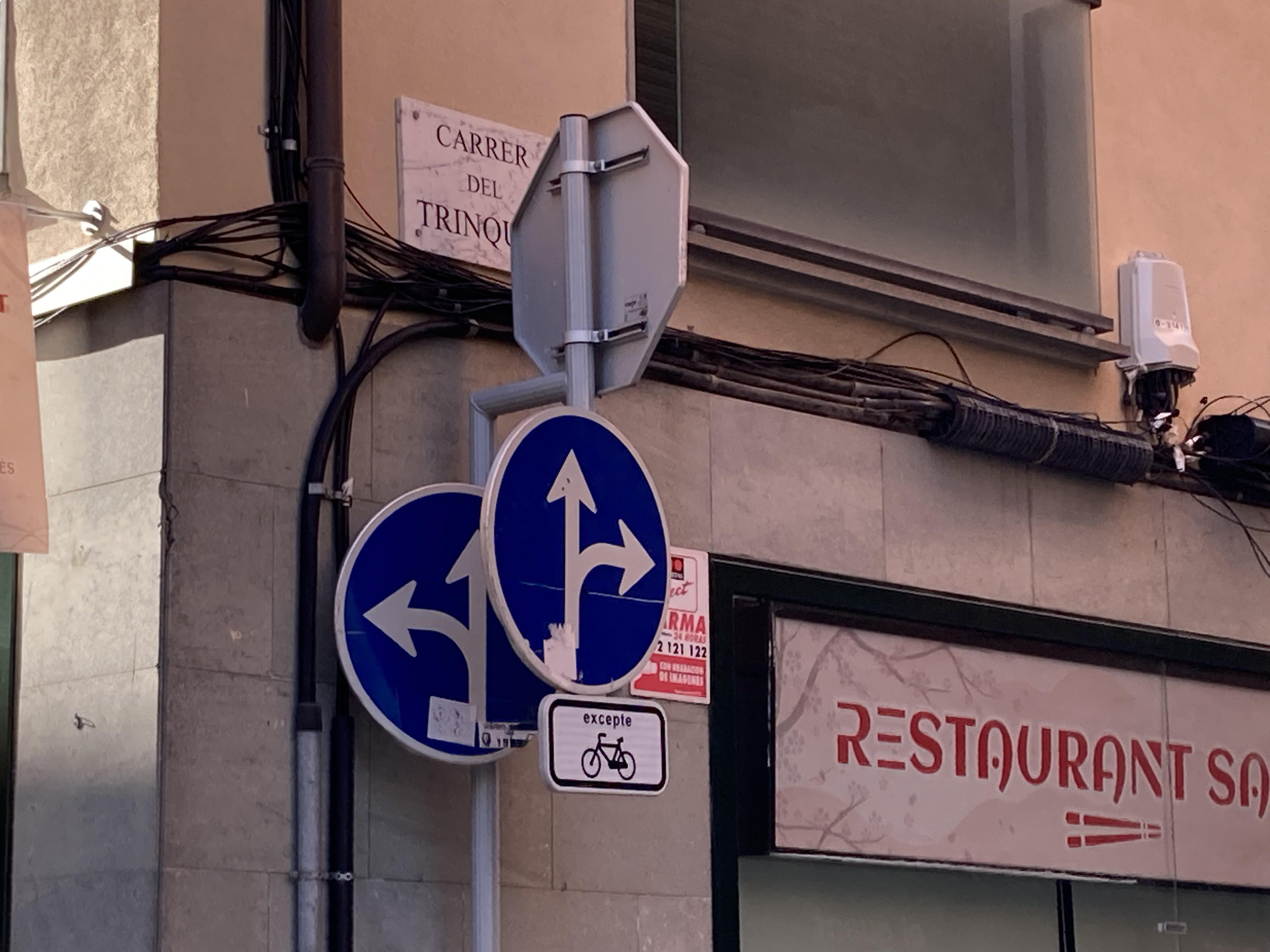 Carrer sant Sebastià amb cantonada sant Antoni. Impossible veure senyals amagats darrere un arbre. Carrer Trinquet / Cr. Fusina / Cr. Sant Fidel… Enrevessament de senyals...