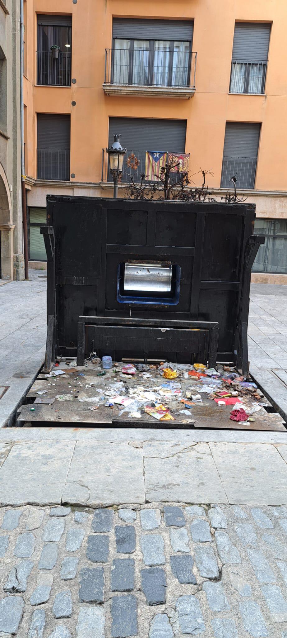 Plaça Pompeu Fabra diumenge a les 9 h més de dues hores sense contenidor de cartró i plàstic, carrer S. Josep igual. Em veig obligada a anar a la rambla a tirar el plàstic, a més aquí veureu com està el fons on va el contenidor.