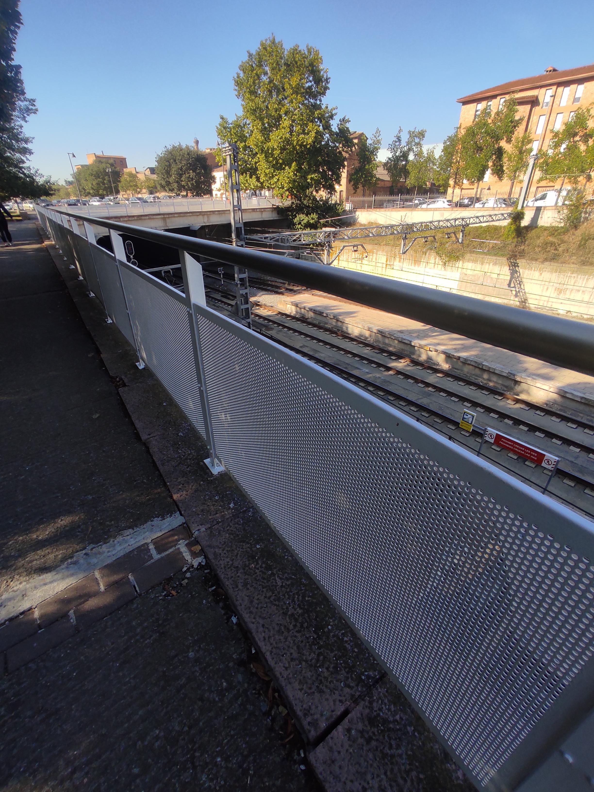 Algunes de les peces rosades de sota la barana, han deixat d'estar fixades i sembla que puguin caure a la via del tren.