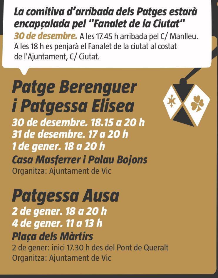 El Patge Berenguer i la patgessa Elisea, arriben el dissabte 30 de desembre. A les 17.45 h arribada pel carrer Manlleu juntament amb el Fanalet de la Ciutat. A les 6 de la tarda es penjarà el fanalet al costat de l'Ajuntament, cr. ciutat, i el patge Berenguer i la patgessa Elisea continuaran fins a la Casa Masferrer i Palau Bujons, on rebran als i les infants que els hi portin les cartes (fotografia adjunta amb els horaris). Si voleu informació del Nadal amb Propòsits, hi trobareu tota la informació d'actes nadalencs, horaris dels patges i patgeses, i cavalcada de Vic. ajvic_nadalambproposits_23_programa