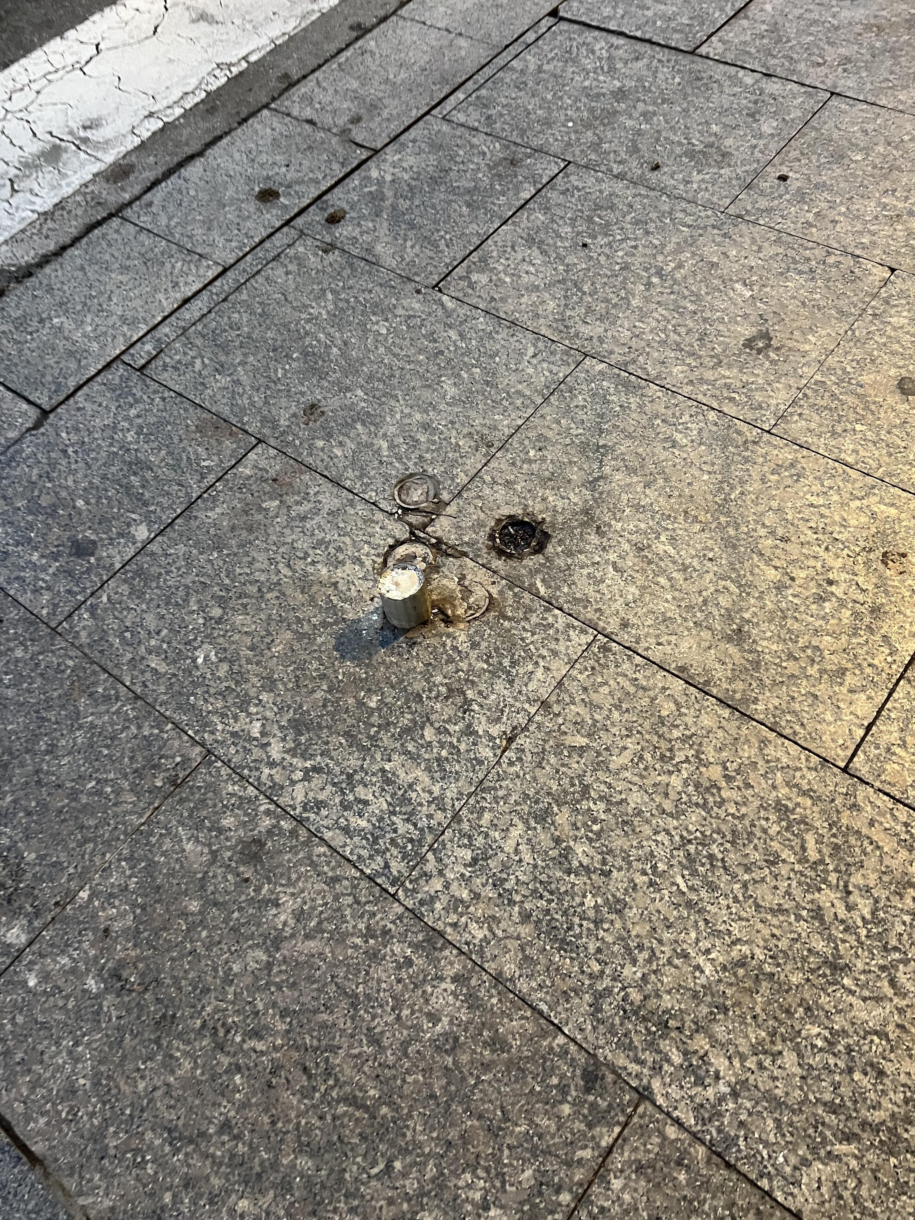 Senyal de tràfic desenganxada del terra, just davant del col·legi d'aparelladors.