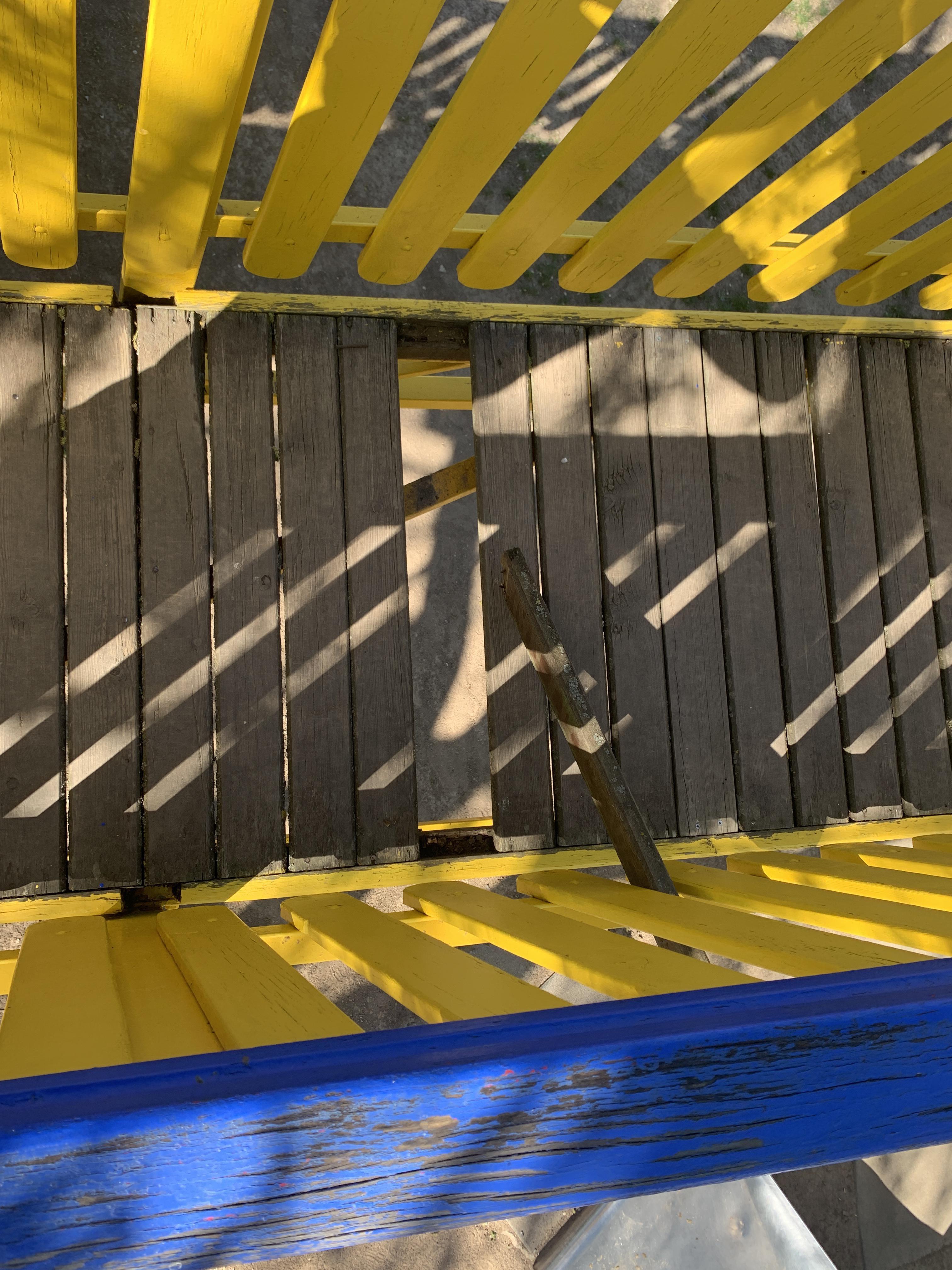 En el parc infantil del pla del Maset ha saltat una lama de la passarel·la, amb el perill que això comporta pels nens que hi juguen. És perillós pel forat i pels cargols rovellats que estan a la vista.