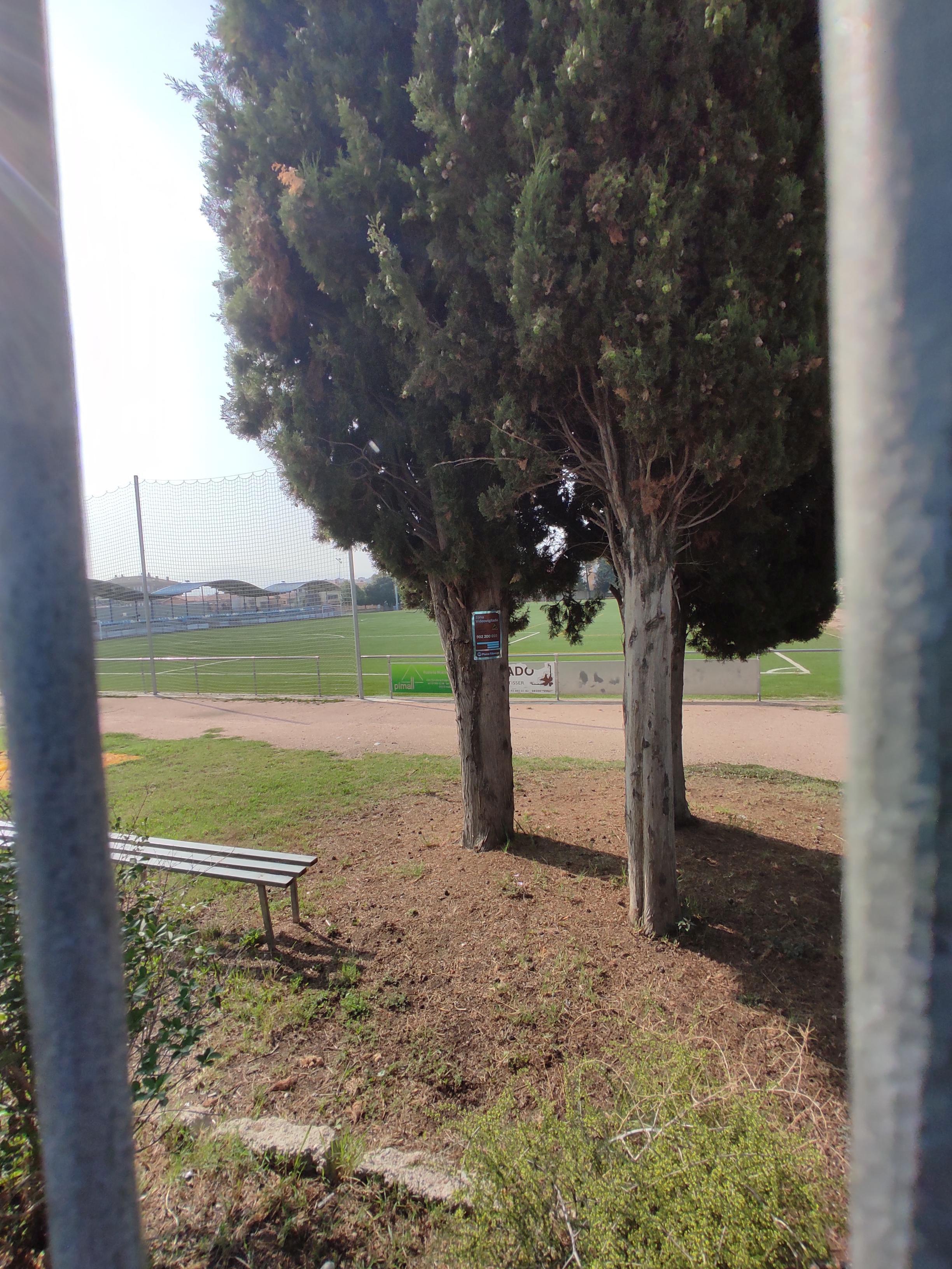 A l'estadi Torras i Bages segurament hi ha algun lloc millor on posar la placa de l'alarma que al tronc d'aquests arbres, estaria bé que es canviés de lloc.