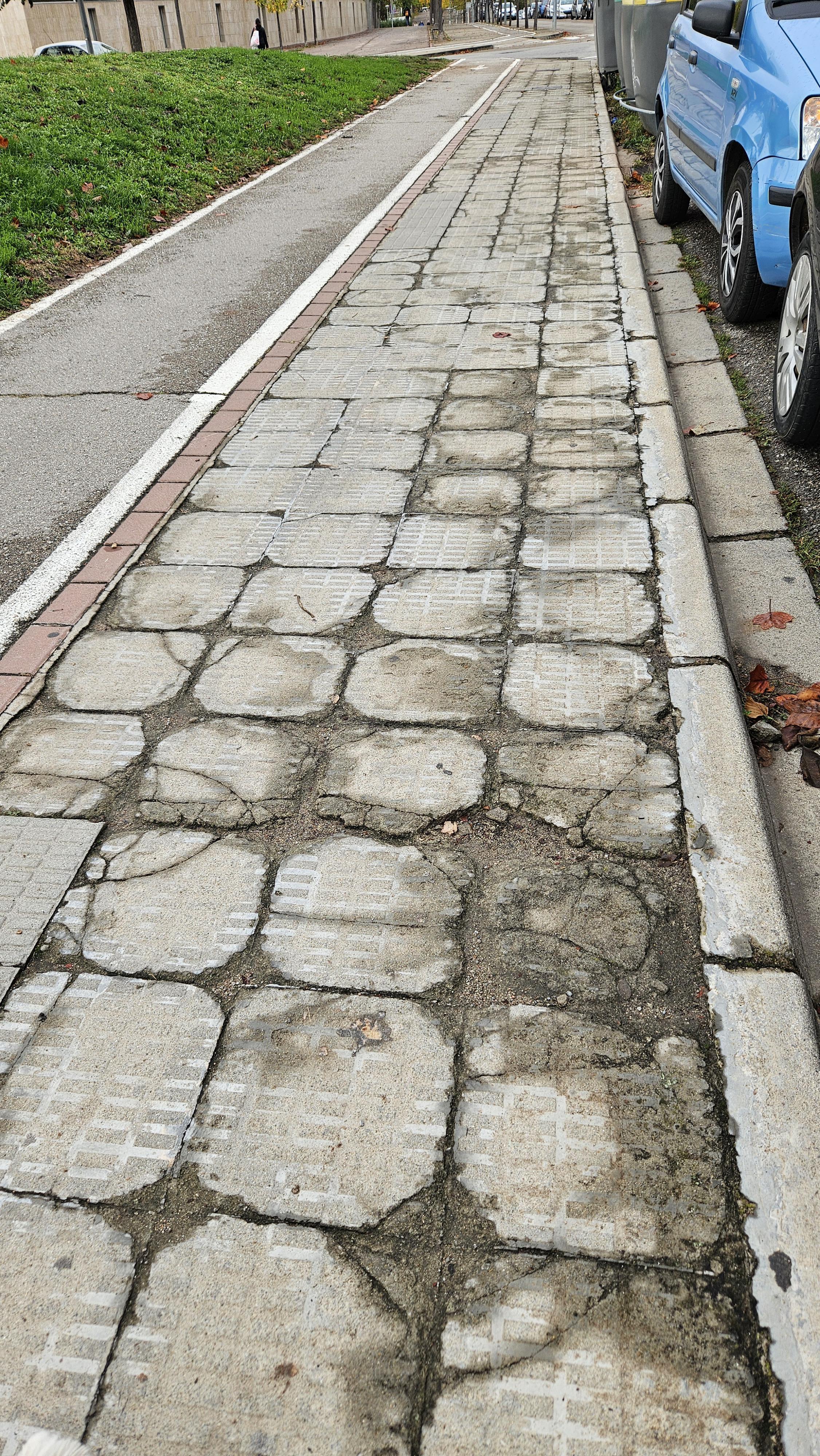 Passem avís al servei de neteja viària perquè netegin d’herbes i brossa el darrere dels contenidors. Generem ordre de treball per reparar la vorera, el tram de rajola hidràulica “panot” s’ha de fer tot el paviment nou.