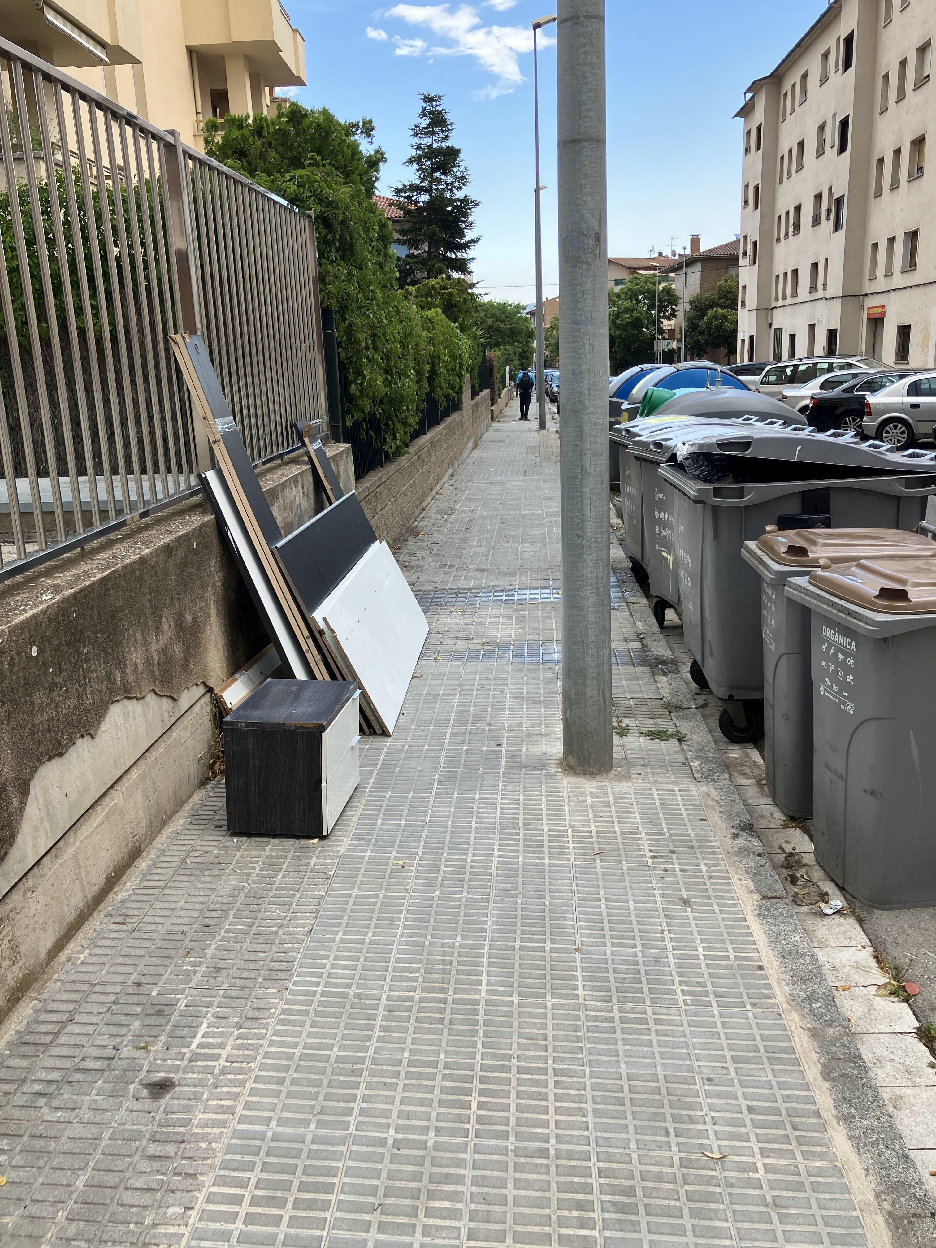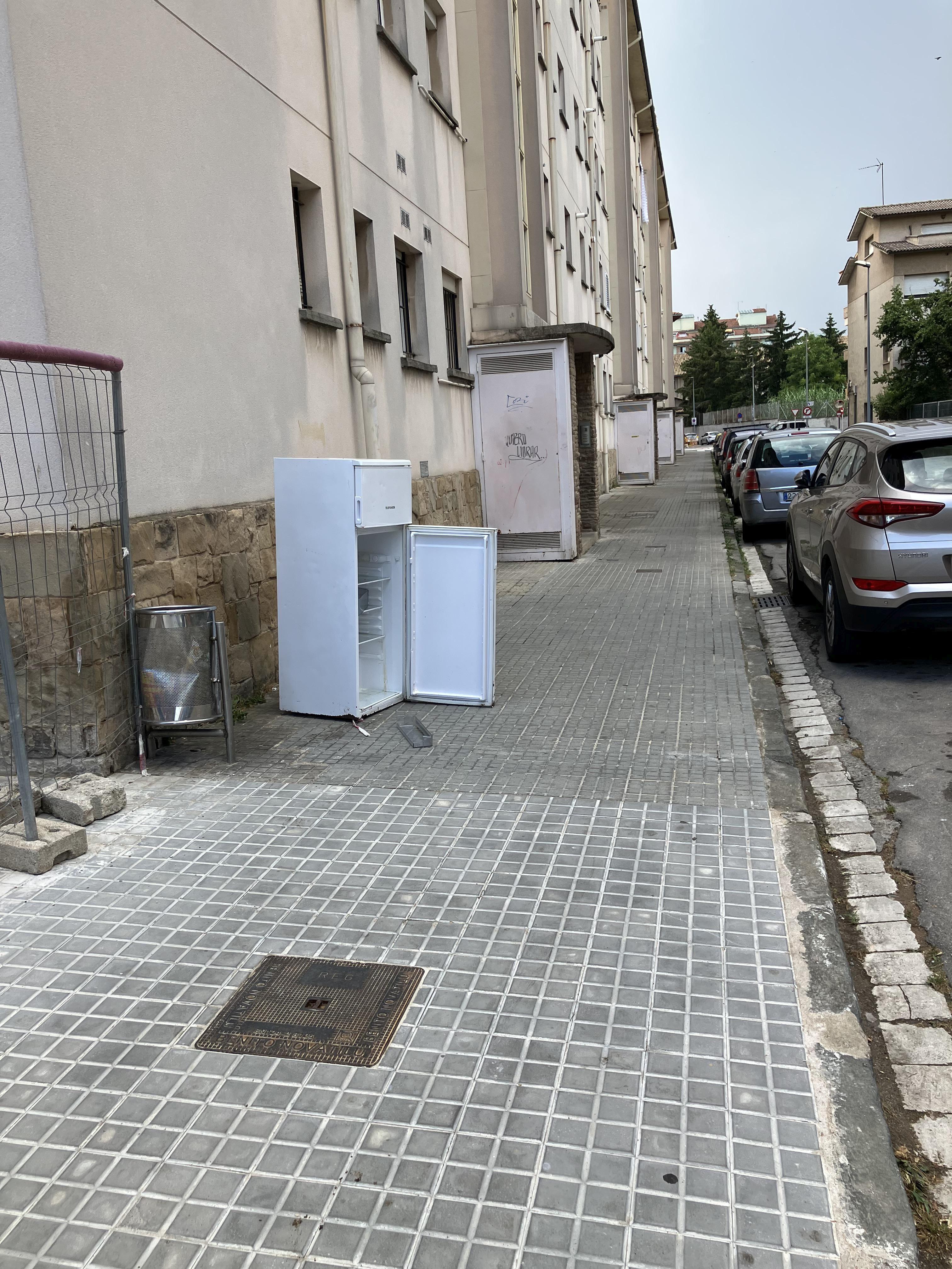 Fa una setmana que al carrer Doctor Salarich hi ha aquests mobles i nevera. En aquest carrer, les escombraries es gestionen molt malament. La gent deixa les escombraries fora del contenidor, bosses de pa a terra, el reciclatge es fa molt malament.
