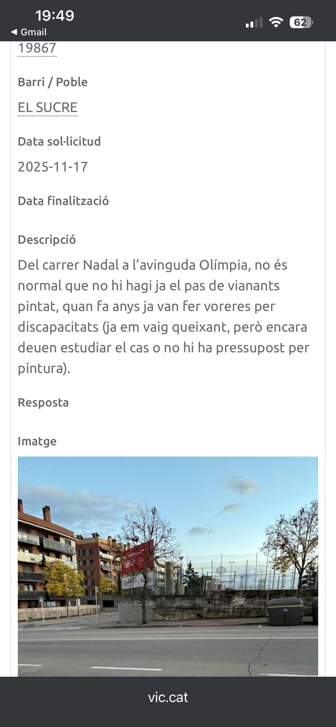 20033És la tercera vegada que em queixo i ja ni responeu! Fa falta pas de vianants entre carrer Nadal i avinguda Olímpia, i fa anys que les voreres estan per discapacitats i o cotxets, però no pinteu mai.https://www.vic.cat/bustia-ciutadana/20033https://www.vic.cat/logo.png