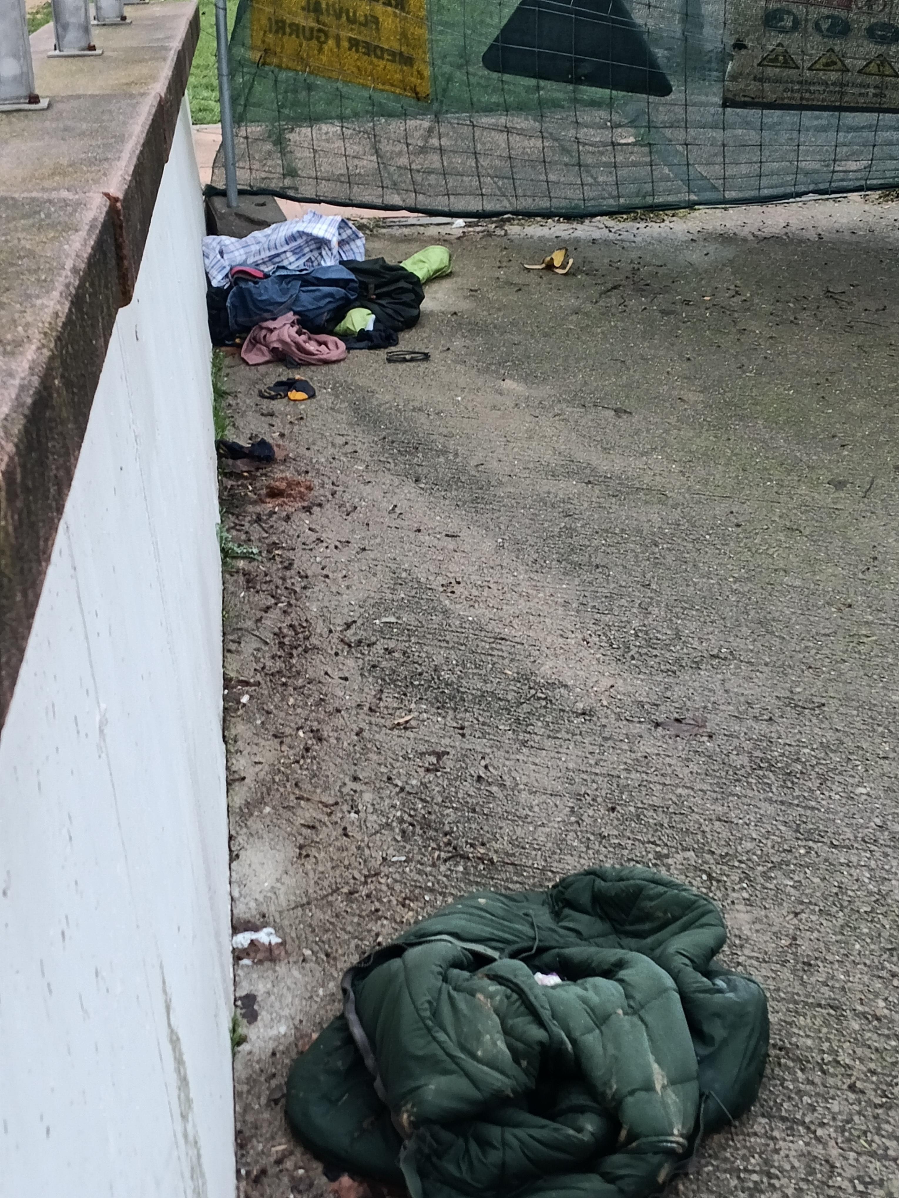 Hi ha un sense sostre a la zona, fa 2 setmanes vaig trobar bossa de roba i restes de femtes a l'entrada del pàrquing. Fa 1 setmana la mateixa bossa i femtes al pont de la Pista on hi ha la balla que prohibeix el pas per obres. Avui sac de dormir, femtes i roba al mateix lloc i al banc que hi ha davant el casal d'avis: roba estesa, calçotets, pantaló i samarreta amb anagrama de Big Mat. Fa fred i no tinc ganes de passejar al gos i haver de donar avís que hi ha un sense sostre que potser està estès a terra i no poder assegurar si està en vida. Amb el fred i humitat és fàcil que aquest sense sostre agafi pneumònia, el sac de dormir de color verd que hi ha està humit i al costat de les femtes que ell mateix déu fer... n'hi ha dues. Fa 1 setmana també n'hi havien. No ser si deu ser el mateix sense sostre que ronda al caixer de CaixaBank del C/Verdaguer... poseu mesures si us plau. Les papereres de la zona estan plenes i són les 9:24 h, davant la biblioteca Pilarín està plena i amb restes al voltant, al jardí.