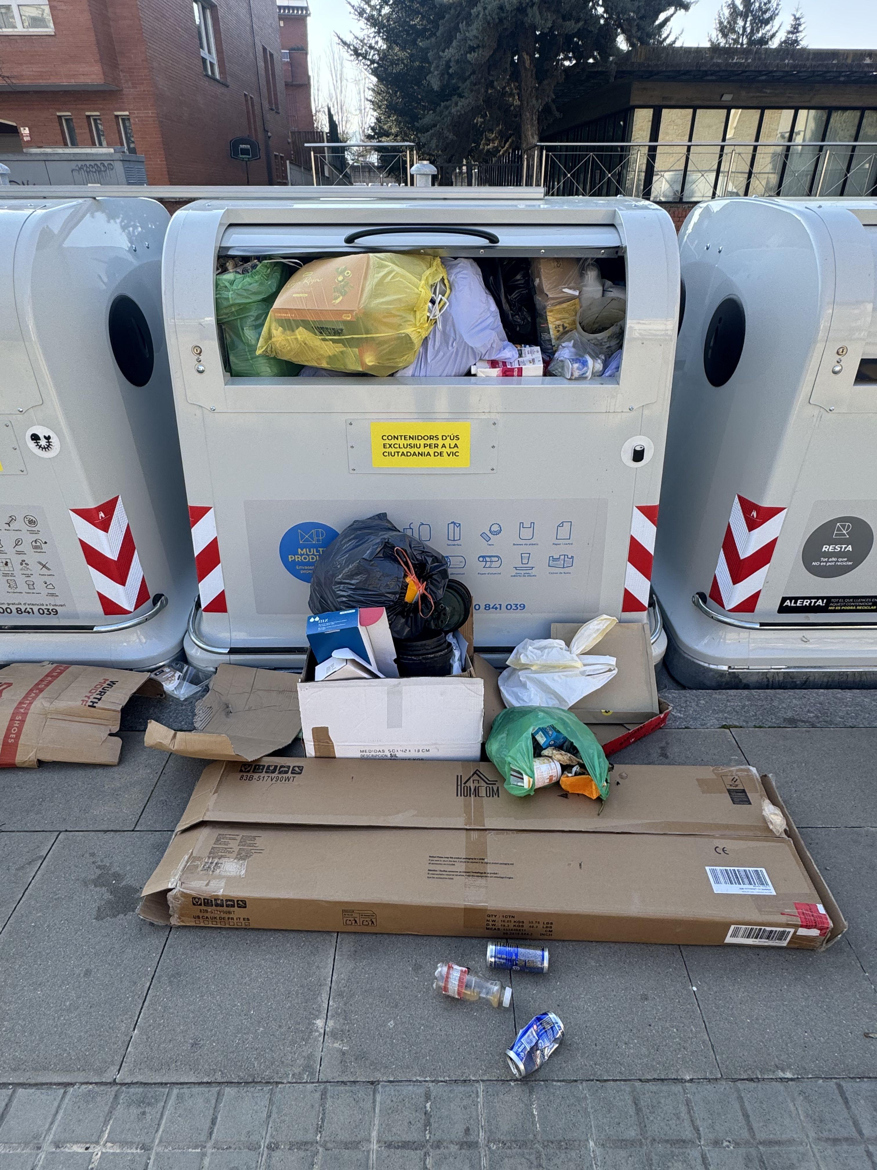 20340En primer lloc donar les gràcies a l'Ajuntament i a la persona que ha decidit unilateralment el canvi d'ubicació dels contenidors al nostre carrer, doncs ens ha quedat un carrer molt maco, com podeu veure a les fotografies. Ja que això no voleu canviar-ho, almenys preocupeu-vos de la neteja i recollida, ja que des de dijous passat que ningú ha recollit la brossa que hi ha a la vorera, tot i que ha passat el camió, però només agafa la del contenidor. Tant incívic és el que deixa la brossa fora, com el que passa a recollir-la i no la recull tota. Us aniré informant gràficament de l'estat del carrer. Salutacions.https://www.vic.cat/bustia-ciutadana/20340https://www.vic.cat/logo.png