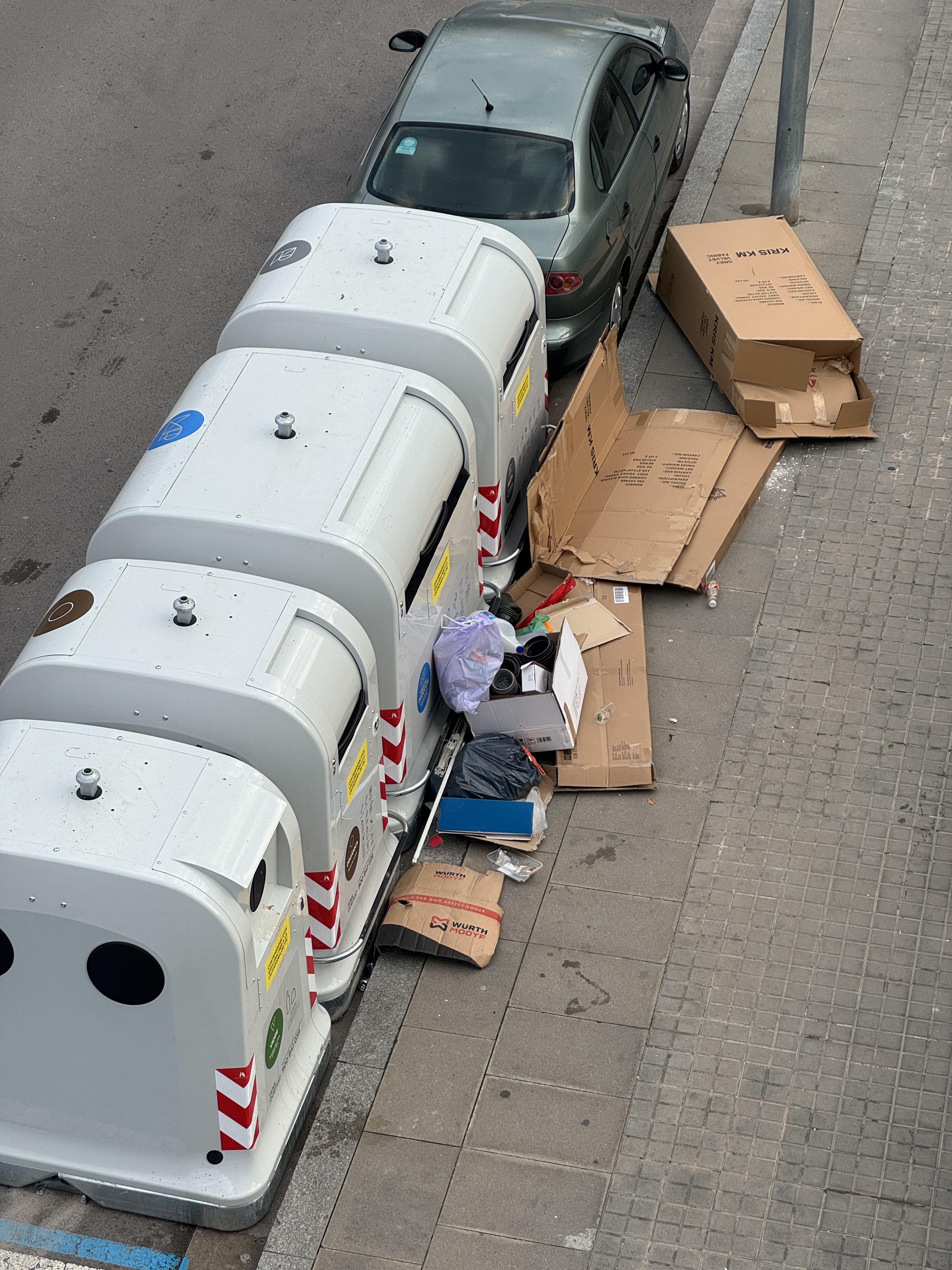 En primer lloc donar les gràcies a l'Ajuntament i a la persona que ha decidit unilateralment el canvi d'ubicació dels contenidors al nostre carrer, doncs ens ha quedat un carrer molt maco, com podeu veure a les fotografies. Ja que això no voleu canviar-ho, almenys preocupeu-vos de la neteja i recollida, ja que des de dijous passat que ningú ha recollit la brossa que hi ha a la vorera, tot i que ha passat el camió, però només agafa la del contenidor. Tant incívic és el que deixa la brossa fora, com el que passa a recollir-la i no la recull tota. Us aniré informant gràficament de l'estat del carrer. Salutacions.