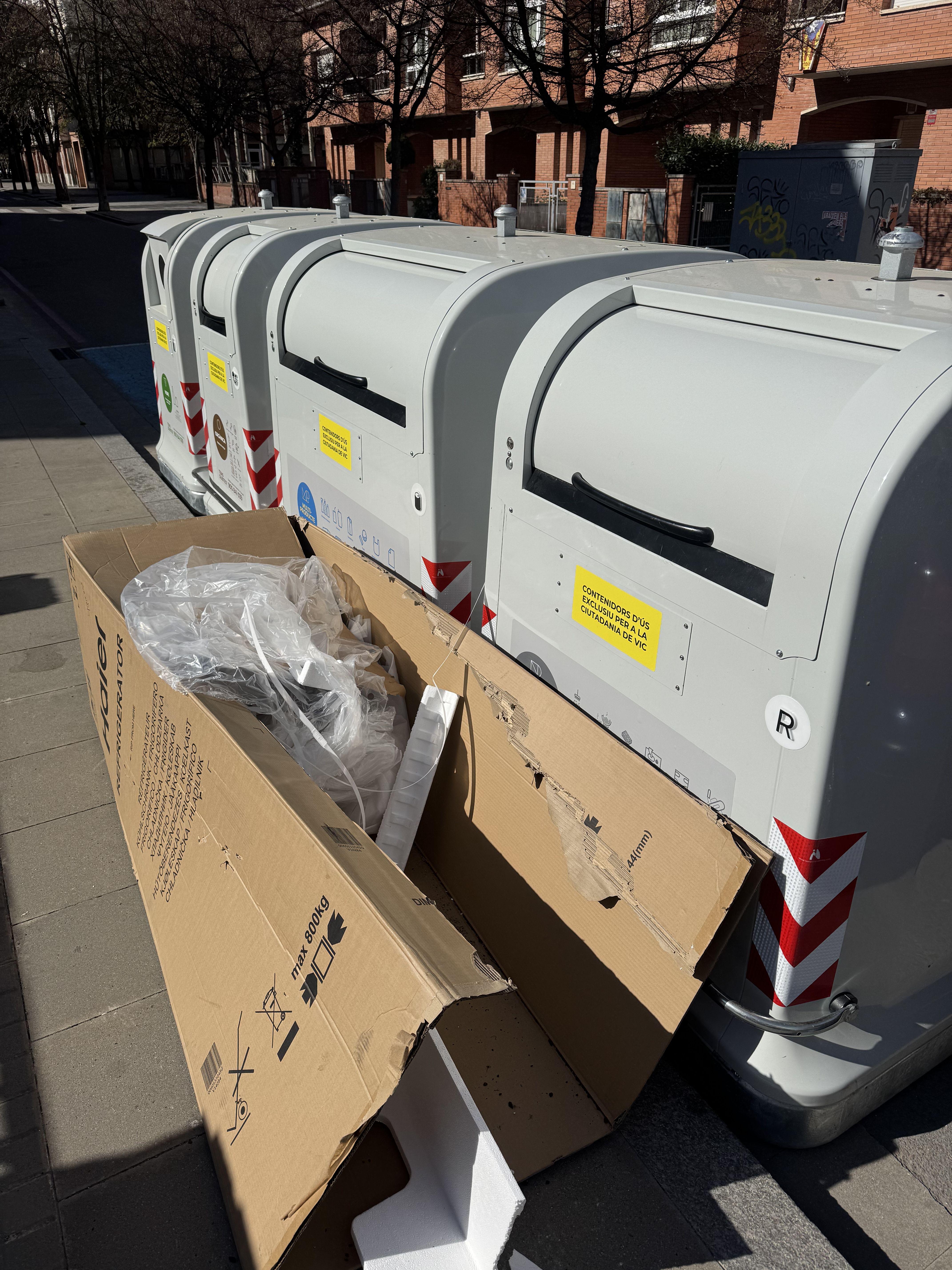 La capsa que veieu a la foto, porta aquí a terra des de diumenge, dificultant apropar-se als contenidors pel que genera més coses a fora, i ara mateix, acaba de passar el camió que recull el paper i cartró i ho ha deixat a terra! Qui ho ha de recollir el que hi ha a la vorera just davant dels contenidors?, i quants dies passaran fins que algú ho reculli? Us hauríeu de preocupar d'aquest tema i parlar-ne amb els dels camions...