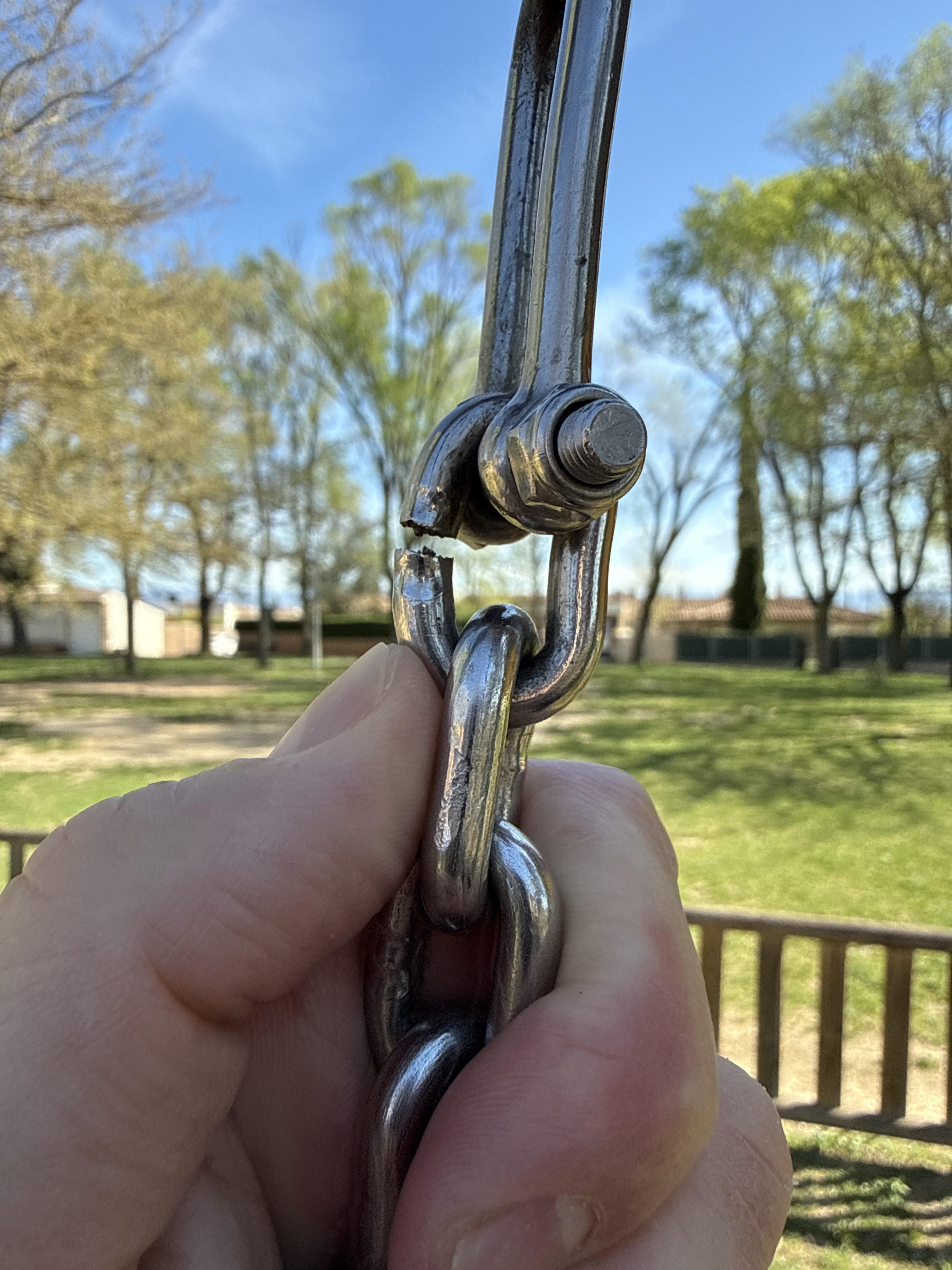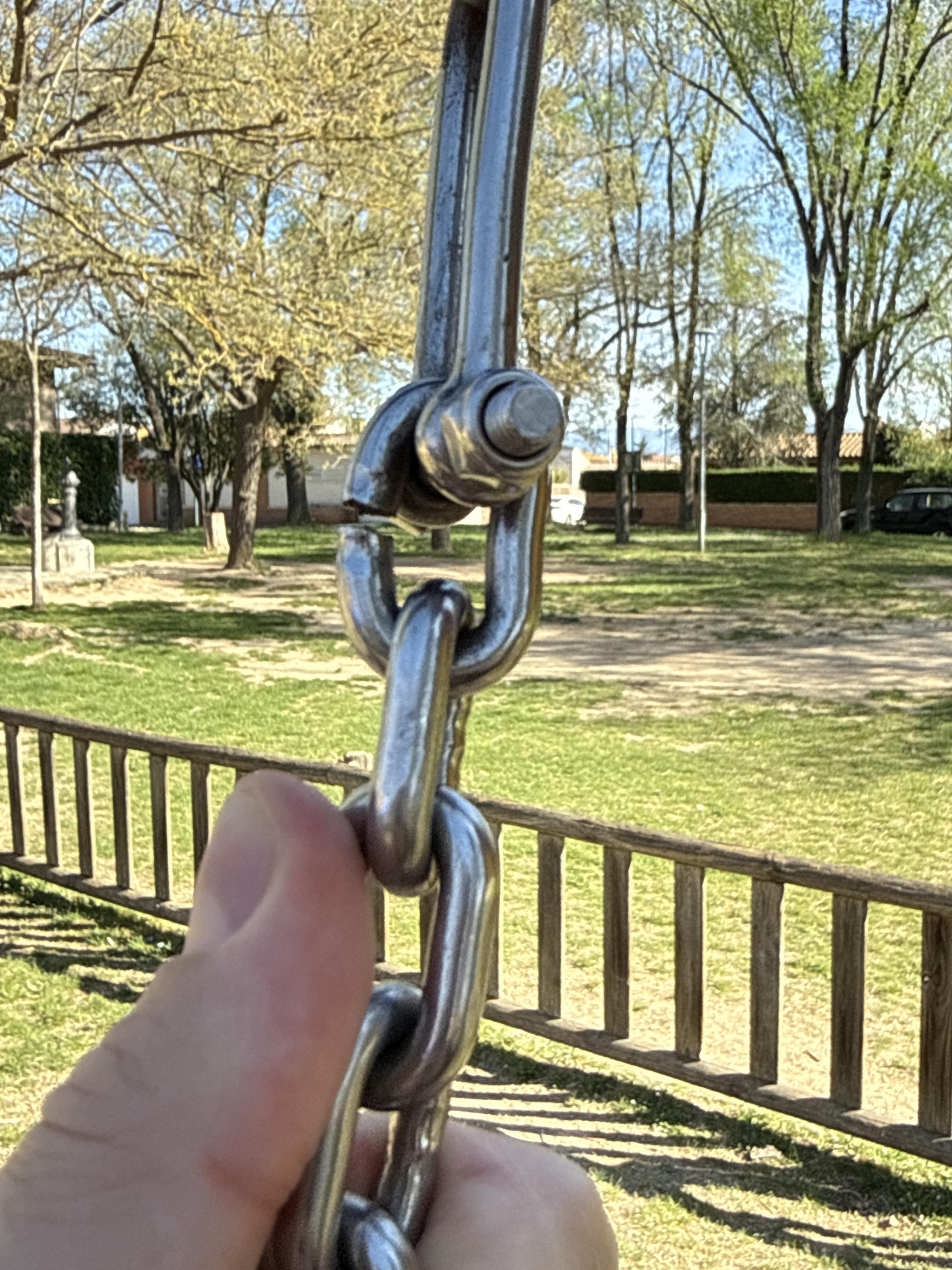 Gronxador infantil amb la soldadura de la cadena trencada. Gran risc de seguretat per als més petits.
