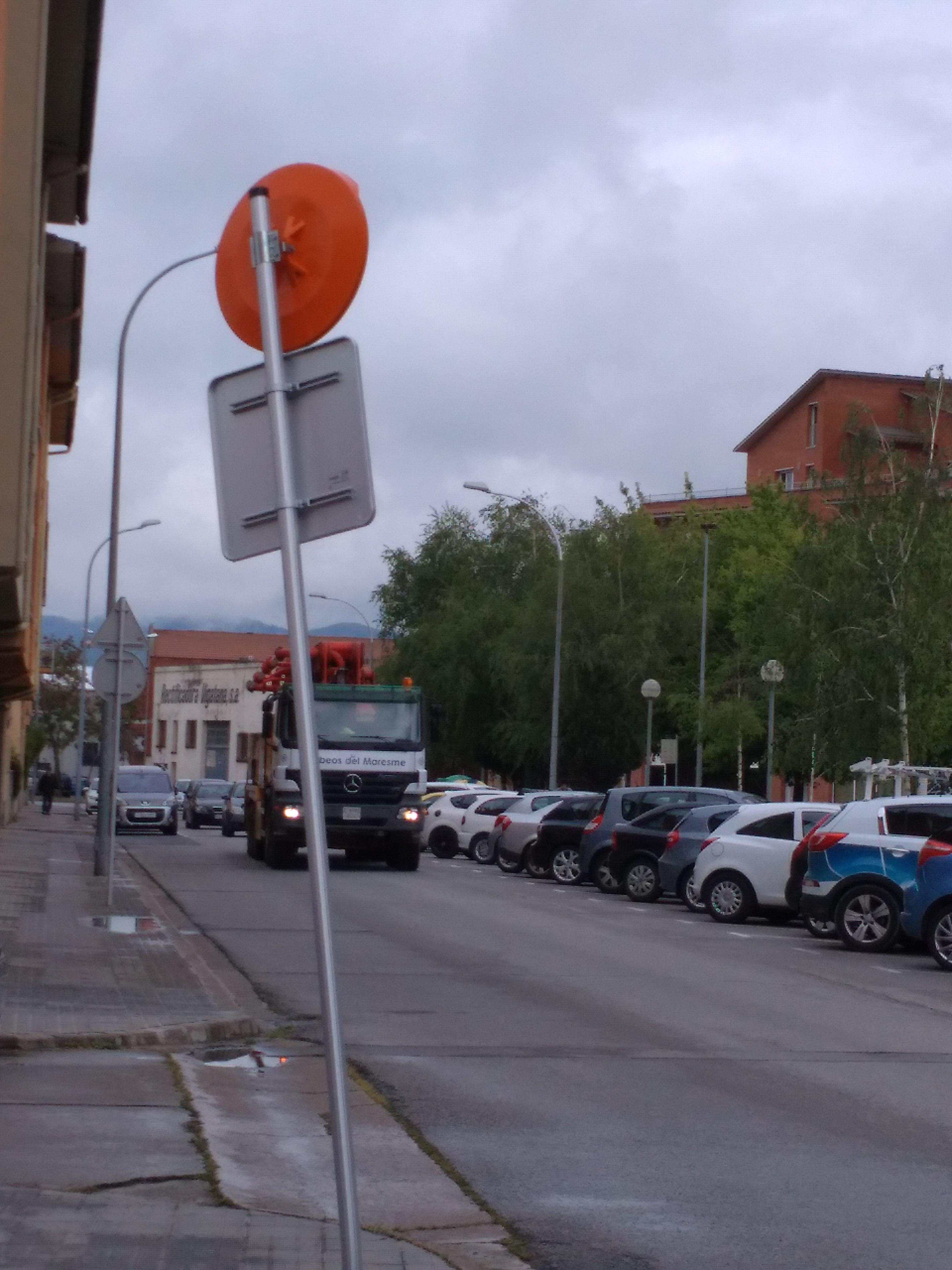 El senyal de la plaça minusvalidesa i el retrovisor del bloc de la farmàcia en el carrer Josep M. Pallàs , està tombat, preguem revisió.