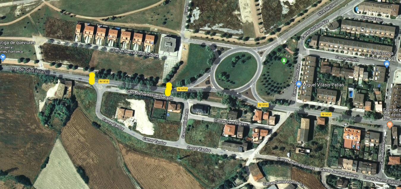 Vaig a peu de Vic a Calldetenes per diferents coses, trobo que per traspassar la carretera és molt complicat, ja que no hi ha cap pas de vianants i això és perillós. He marcat a la foto uns llocs adients per poder fer-los.