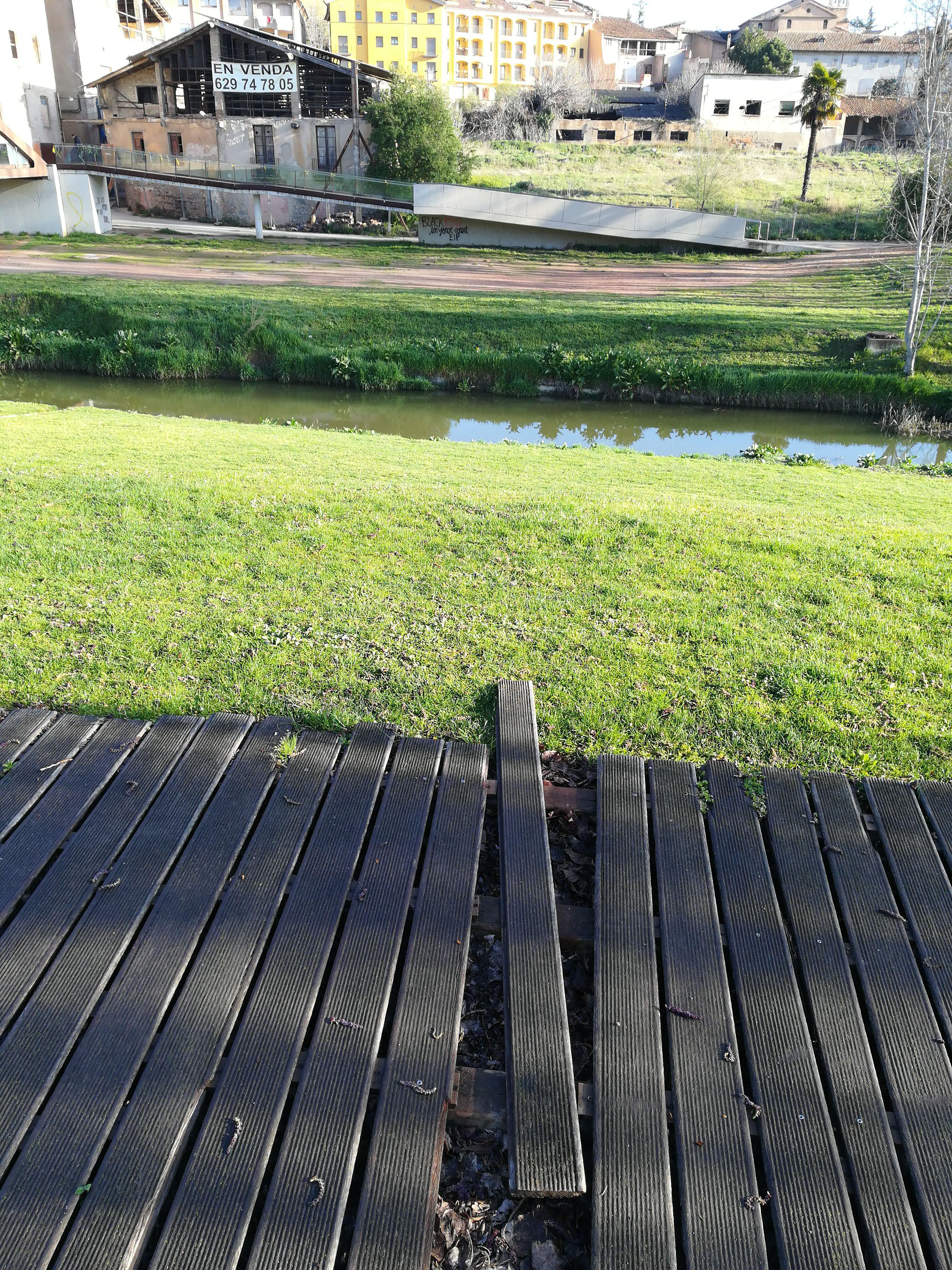 A la passarel·la de fusta que hi ha davant teatre Atlàntida , a l'altre costat del riu, hi falta una fusta i n'hi ha una altra desenganxada.