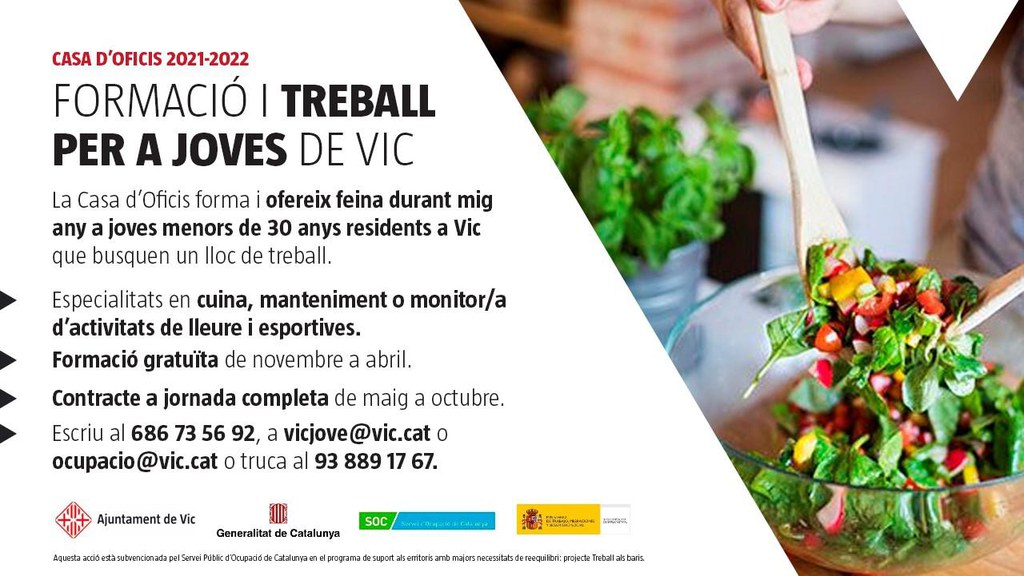 La Casa d’Oficis torna el mes de novembre per oferir als joves la possibilitat de treballar i formar-se gratuïtament a la vegada, fent obres als barris o oferint serveis públics a la ciutadania. La iniciativa promoguda per l’Ajuntament de Vic permet escollir entre tres especialitats: cuina, animació en activitats de lleure i esportives i manteniment d’espai públics i habitatge.