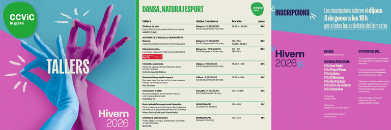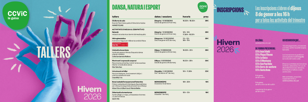 - Les inscripcions s’obren el dijous 8 de gener a les 16 h per a totes les activitats del trimestre, tant en línia a la pàgina web centrescivics.vic.cat com de forma presencial.