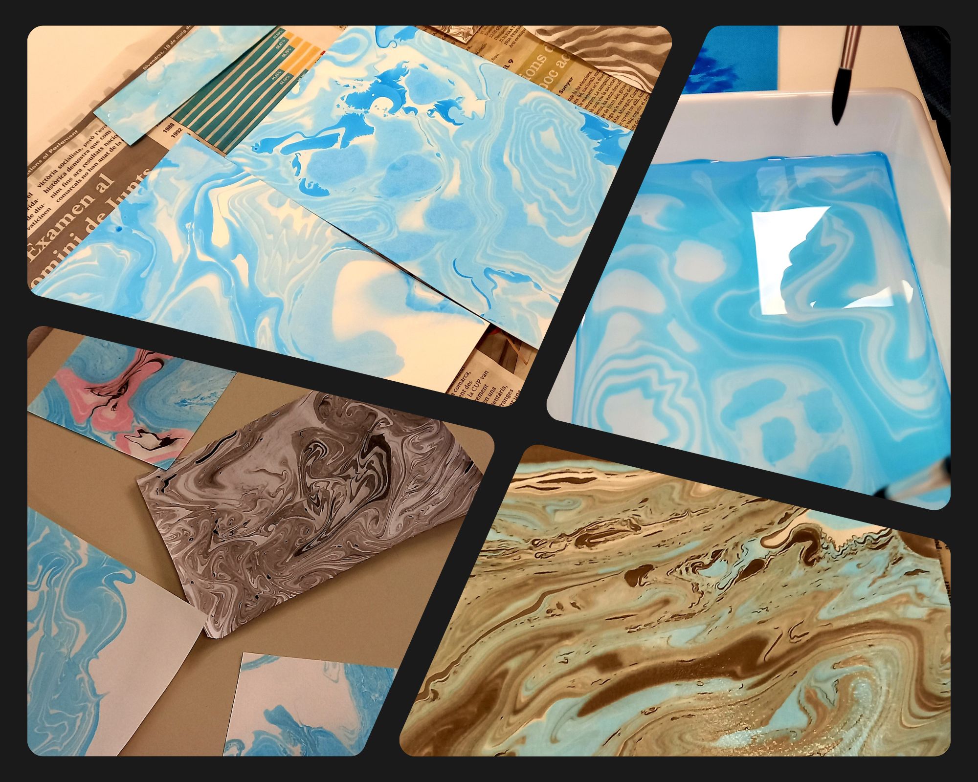 La tallerista Eva Pujol ha explicat com es s'aplica aquest marbrejat de paper amb tinta de diferents colors. En principi cada persona n'ha escollit un; cap al final s'han fet composicions amb més d'un color.