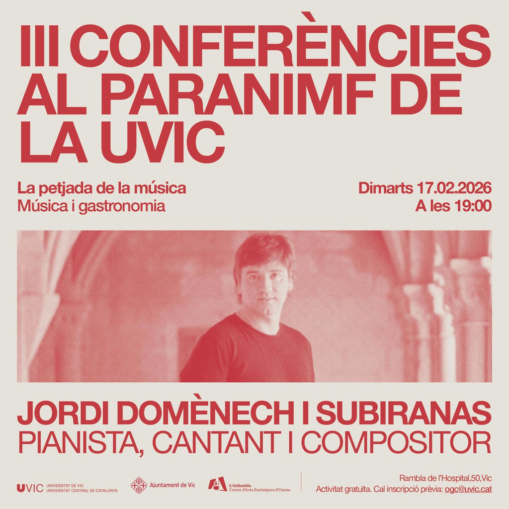 La primera conferència tindrà lloc el dimarts 17 de febrer, a les 19.00 h, al Paranimf de la UVic-UCC (c. Rambla de l’Hospital, 50, Vic), i anirà a càrrec de Jordi Domènech, pianista, cantant i cantautor, amb la ponència «Música i gastronomia».