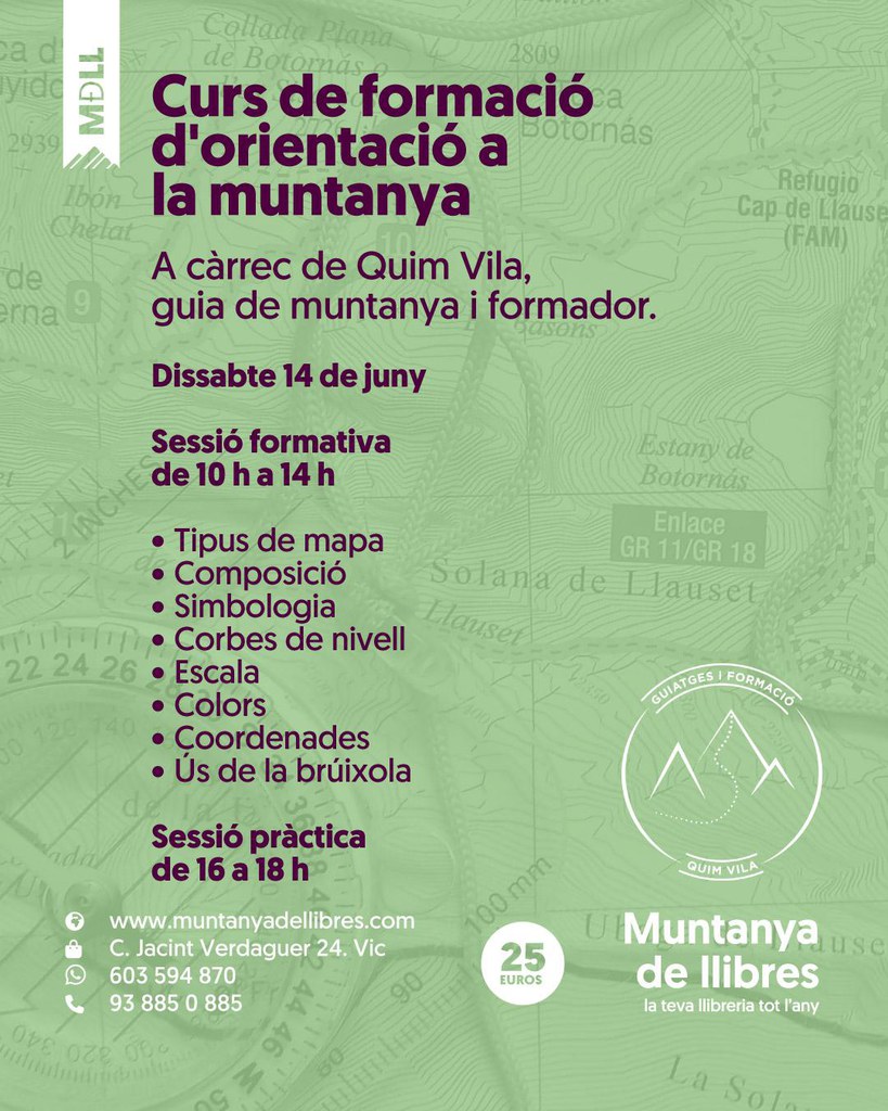 Curs de formació d'orientació a la muntanya a càrrec de Quim Vila, guia de muntanya i formador. En aquesta formació s'explicarà com entendre un mapa, treure'n tota la informació que ens dona, com i quan el podem utilitzar. També s'explicarà la funcionalitat, protocols, ús i com podem fer servir la brúixola en un mapa. A la tarda es posarà en pràctica els coneixements adquirits a la sessió formativa.