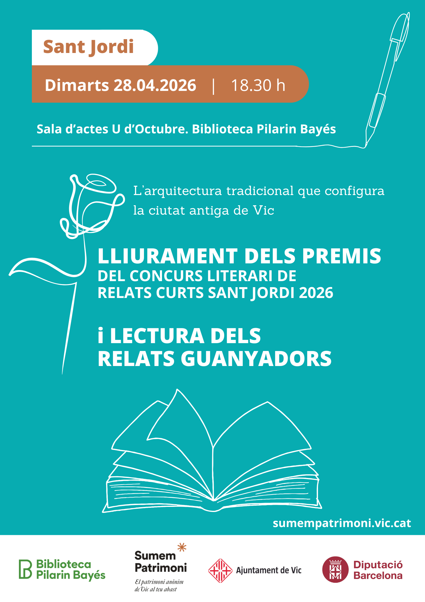Des del projecte de Sumem Patrimoni i la biblioteca Pilarin Bayés es convoca el CONCURS LITERARI DE RELATS CURTS SANT JORDI 2026, amb l’objectiu de d’acostar la ciutat de Vic a través de relats sobre anècdotes relacionades amb elements tradicionals dels edificis que la configuren i la fan única.
