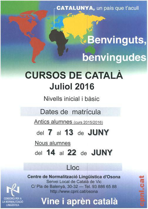 El proper dimarts dia 7 de juny s’obre el període de matrícula per als cursos de català que es duran a terme durant el mes de juliol (nivells inicial i bàsic) i organitzats pel Centre de Normalització Lingüística d’Osona.
