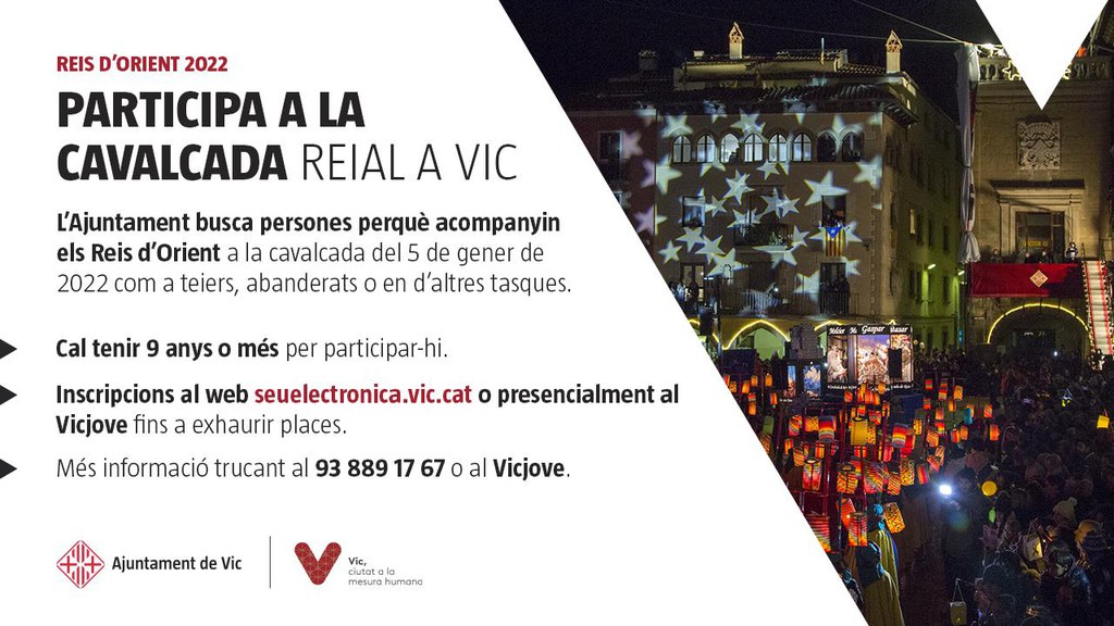 La Cavalcada de Reis de Vic és possible gràcies a la participació de nombroses persones que s'inscriuen gràcies a aquesta crida ciutadana. Des de l'Ajuntament es recorda que la quitxalla, jovent o persones adultes que acompanyen els reis Melcior, Gaspar i Baltasar podran fer-ho com a teiers, abanderats, tamborers o en d'altres tasques d'una de les Cavalcades més tradicionals i emblemàtiques del país.