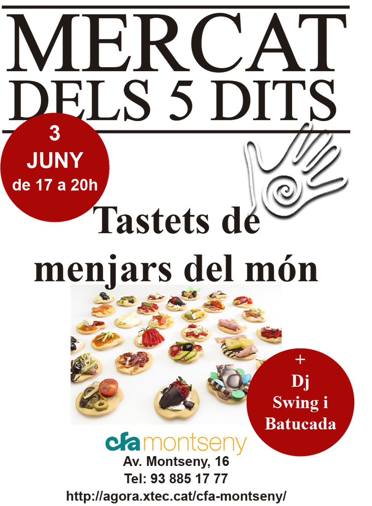 El proper divendres 3 de juny de les 17:00 a les 20:00 hores el Centre de Formació d’Adults Montseny organitza la festa del Mercat dels 5 dits. El Mercat en qüestió tractarà de parades de menjars típics d'arreu del món elaborat pel mateix alumnat del centre, tot aprofitant la gran diversitat de nacionalitats que hi tenim, i per altres entitats que també s'hi apuntin.
