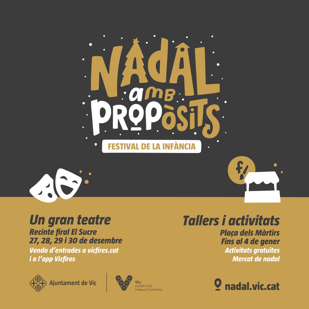 L’Ajuntament de Vic recupera el Festival de la Infància, que torna renovat, i s’amplia cap a la plaça dels Màrtirs. La nova ubicació acollirà els tallers i activitats del Festival fins al 4 de gener. Paral·lelament, el recinte firal es convertirà del 27 al 30 de desembre en “Un Gran Teatre” on s’hi representaran espectacles pel públic més familiar.