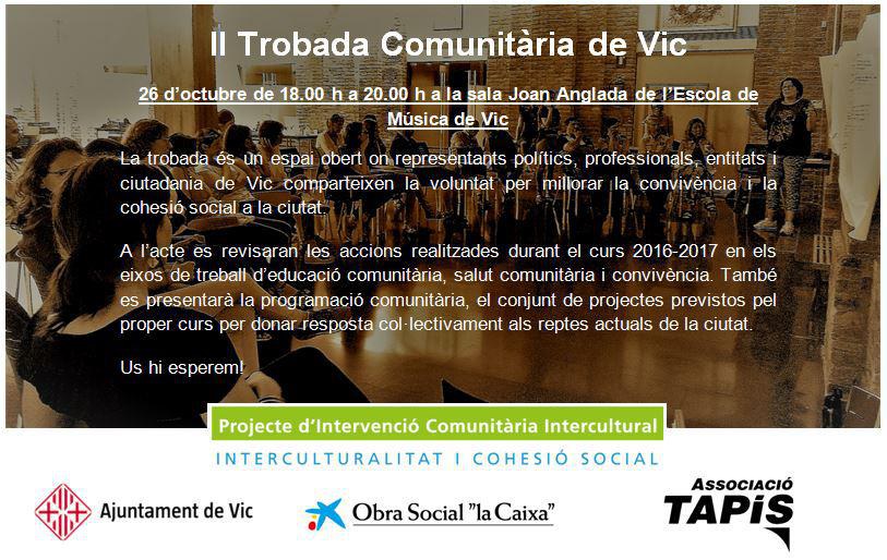 Demà dijous 26 d’octubre tindrà lloc la II Trobada Comunitària de Vic, a les 18:00h a la sala Joan Anglada de l’Escola de Música de Vic.