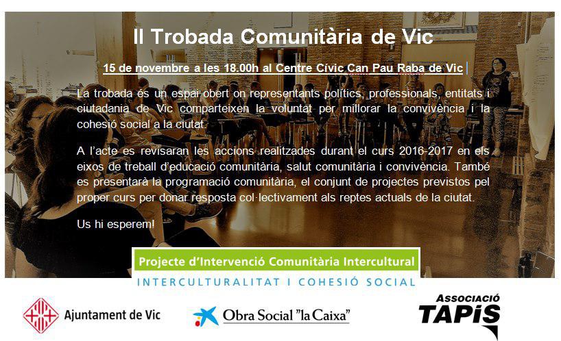 Aquest dimecres 15 de novembre tindrà lloc la II Trobada Comunitària de Vic, a les 18:00h, al Centre Cívic Can Pau Raba de Vic.