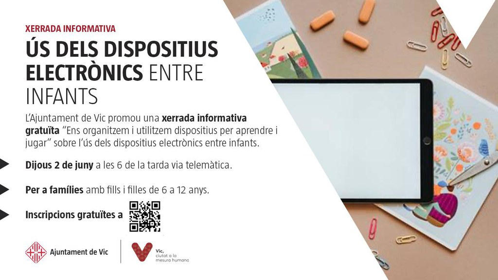 L’Ajuntament de Vic organitza la xerrada informativa gratuïta “Ens organitzem i utilitzem dispositius per aprendre i jugar” sobre l’ús dels dispositius electrònics entre els infants a càrrec d’Anna Ramis. L’activitat està orientada a familiars amb fills i filles de 6 a 12 anys.