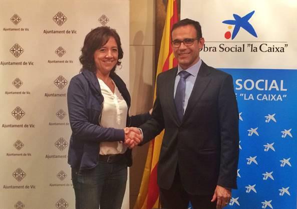 L’alcaldessa de Vic i Presidenta de la Fundació Atlàntida, Anna Erra, i el director territorial de Caixabank a Catalunya, Jaume Masana, han firmat aquesta tarda l’acord que renova la col·laboració entre l’Atlàntida i l’Obra Social “La Caixa” que ajuda a finançar projectes de caire social com l’Aula de Musicoteràpia, el projecte “Si toquem junts, sona millor” o el Banc d’Instruments.