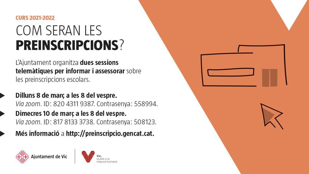 L'Oficina Municipal d'Escolarització (OME) de l'Ajuntament de Vic organitza dues sessions informatives per acompanyar i assessorar en el procés de preinscripció escolar del curs 2021 - 2022, que serà telemàtic. Les sessions es faran a través de la plataforma Zoom avui, dilluns 8 de març, i dimecres vinent, 10 de març, a les 8 del vespre.