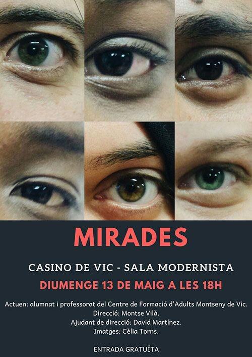 L’alumnat de teatre del Centre de Formació d’Adults Montseny representarà l’obra, creada a partir d’experiències pròpies que han viscut a la nostra ciutat. “Mirades” és una aproximació a aquesta realitat a través del llenguatge escènic: el racisme explicat per persones reals que el pateixen cada dia.