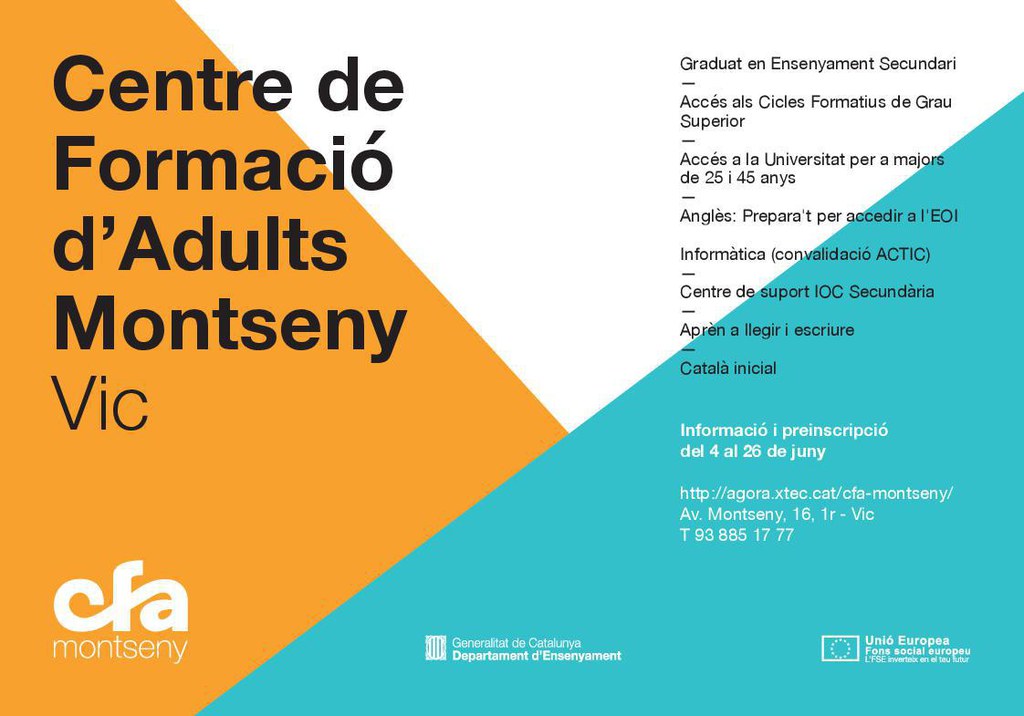El Centre de Formació d'Adults Montseny obre aquest dilluns 4 de juny el període de preinscripció pel curs 2018-2019.