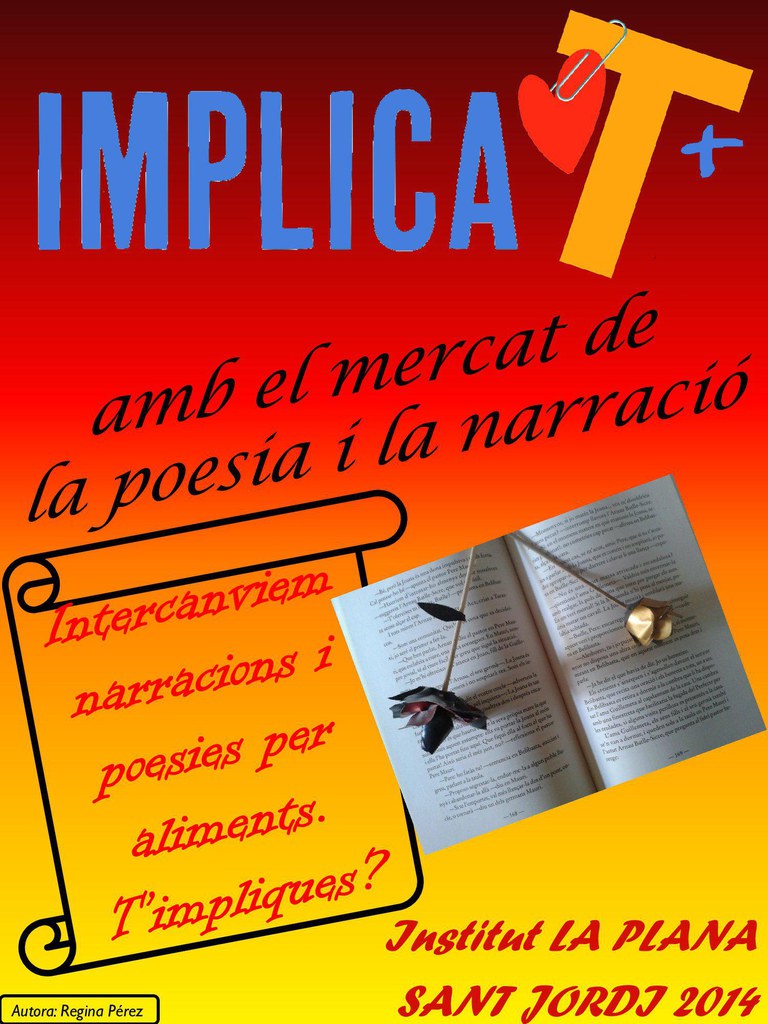Consisteix en fer un INTERCANVI DE POESIES I NARRACIONS PER ALIMENTS. Aquestaactivitat s’inclou dins el projecte IMPLICA’T + del qualen som centre col·laborador.Es tracta de treballs literaris que els alumnes dels diferents nivells educatius han realitzat i que l’alumnat de batxillerat intercanviarà per aliments amb tothom que vulgui col·laborar-hi: comunitat educativa i ciutadania en general. Hi haurà parades del MERCAT DE LA LITERATURA davant de l’Institut La Plana i als supermercats Mercadona i Carrefour Express del barri de l’Horta Vermella. Tot el que es reculli anirà al Banc d’Aliments de Vic. L’horari de recollida serà de les 9:00h fins a les 14:00h.