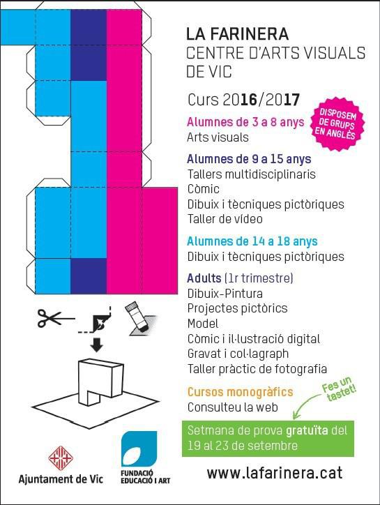 La Farinera, centre d’Arts Visuals de Vic ha obert el període de matrícula pel curs 2016-2017, organitzant alhora una setmana de prova gratuïta adreçada als infants, joves i adults interessats/des en “tastar” algun dels cursos que s’ofereixen.