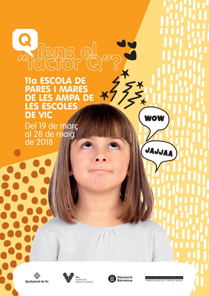 Com a resultat del treball realitzat per les AMPA de la ciutat de Vic, enguany l'Escola de pares i mares de Vic - Tens el Factor Q? - arriba a la seva 11a edició, reafirmant-se com a projecte formatiu de referència entre les famílies i professionals de l’educació del territori.