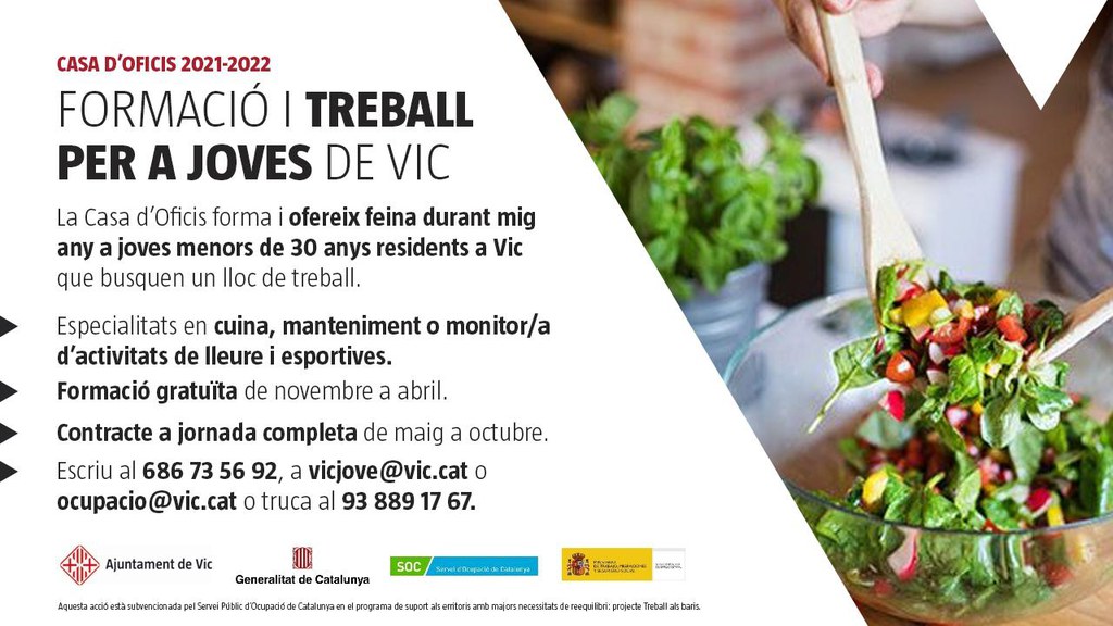 La Casa d’Oficis torna el mes de novembre per oferir als joves la possibilitat de treballar i formar-se gratuïtament a la vegada, fent obres als barris o oferint serveis públics a la ciutadania. La iniciativa promoguda per l’Ajuntament de Vic permet escollir entre tres especialitats: cuina, animació en activitats de lleure i esportives i manteniment d’espai públics i habitatge.
