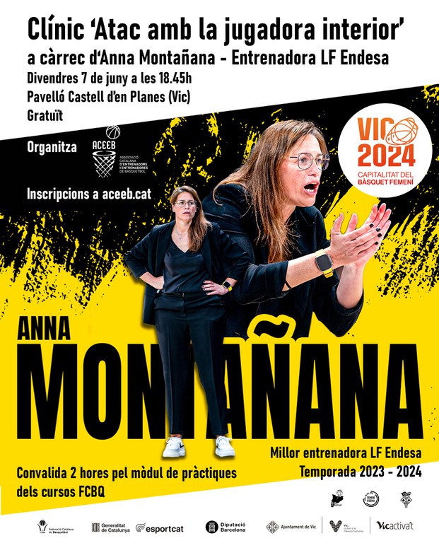 L’Associació Catalana d’Entrenadors i Entrenadores de Basquetbol (ACEEB) i Vic, Capitalitat del Bàsquet Femení 2024, organitzen el pròxim divendres 7 de juny (18.30 h) un clínic amb Anna Montañana. L’entrenadora de l’Hozono Global Jairis parlarà sobre ‘Atac amb la jugadora interior’.