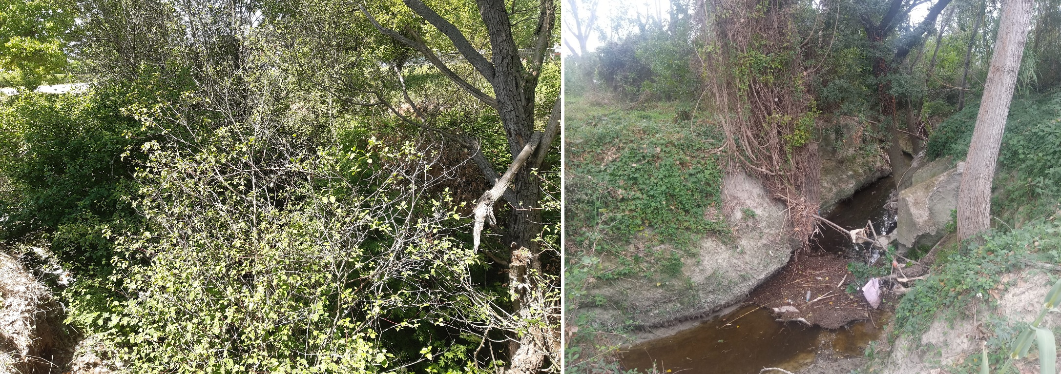Tap de restes vegetals situat al torrent de l'Esperança (esquerra) i situació un cop finalitzada l'actuació (dreta)