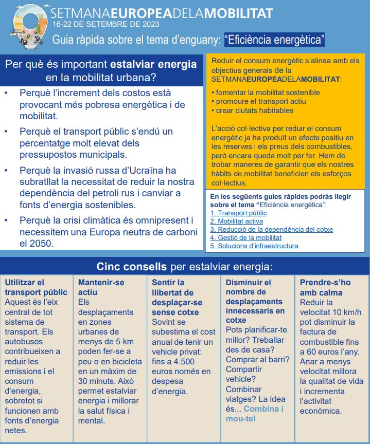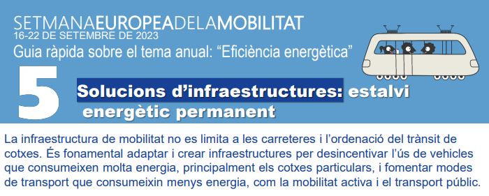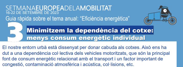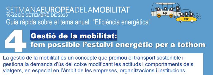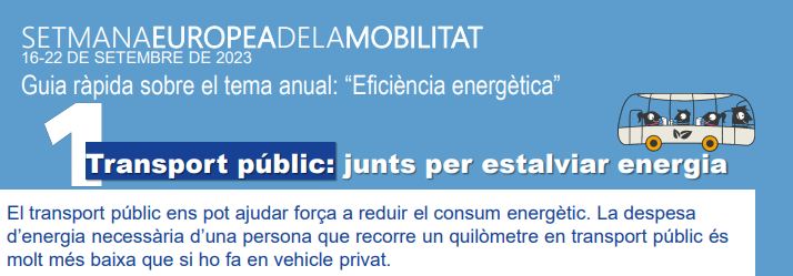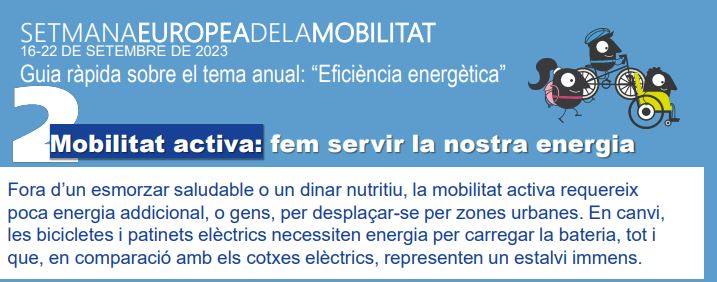 Del 16 al 22 de setembre se celebra a Catalunya la Setmana Europea de la Mobilitat per promoure hàbits de mobilitat més sostenibles, segurs i saludables com són els desplaçaments a peu, amb bicicleta, amb transport públic o amb vehicle elèctric, així com visualitzar els canvis possibles en l’ús de l’espai públic, millorar la qualitat de l’aire i reduir la contaminació.