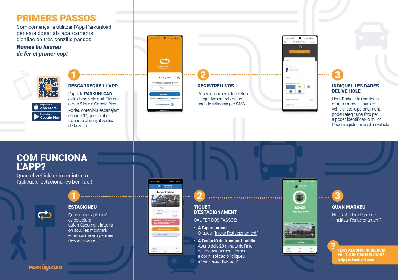 - Baixa l'aplicació mòbil de les plataformes d'aplicacions disponibles per a cada sistema operatiu. En les senyals verticals de l'aparcament i en el tríptic hi ha un codi QR a través del qual també es pot baixar.