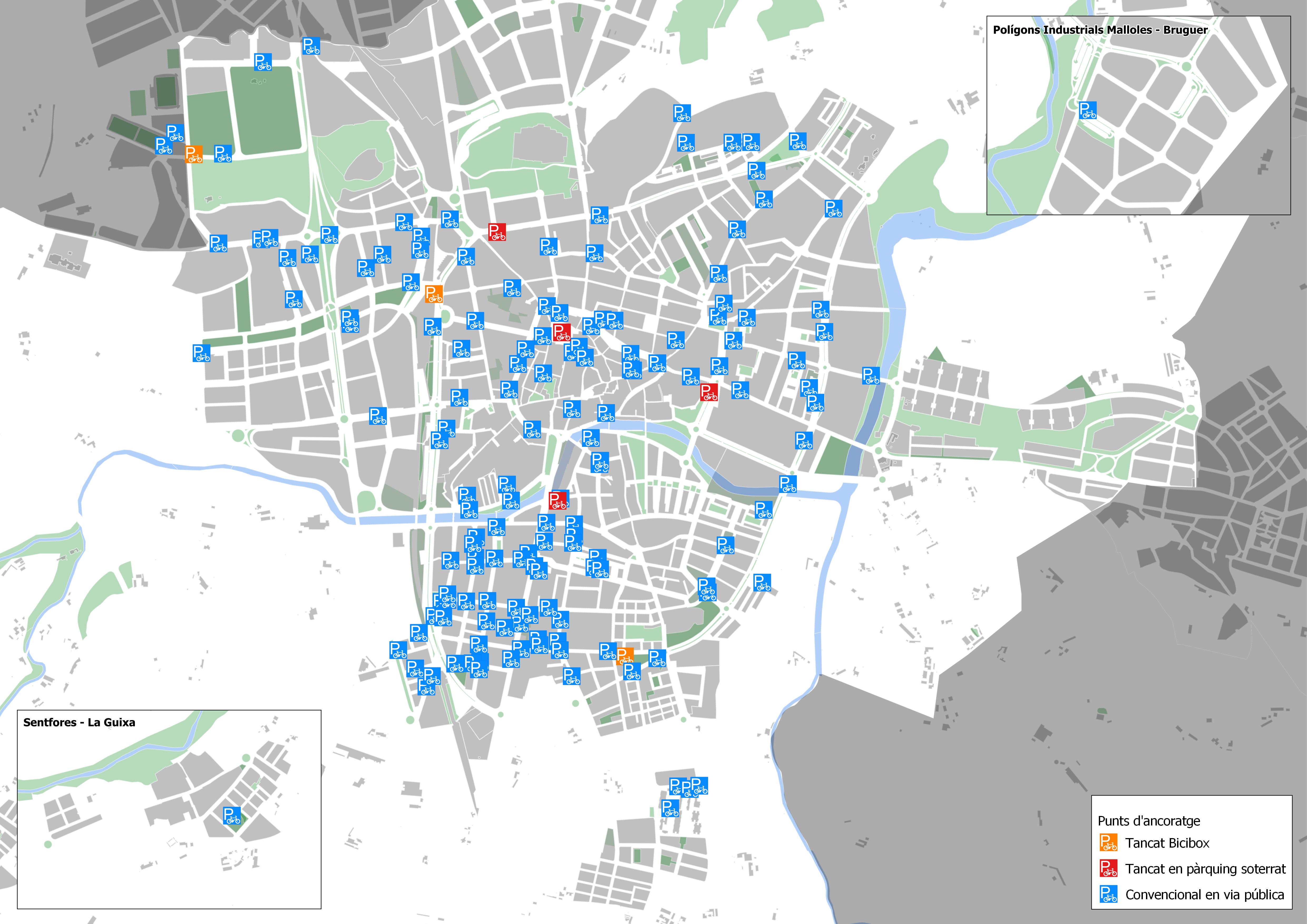 Aquests aparcaments es troben situats prop dels principals centres atractors / generadors de mobilitat del municipi, i també de la xarxa de vies ciclistes.