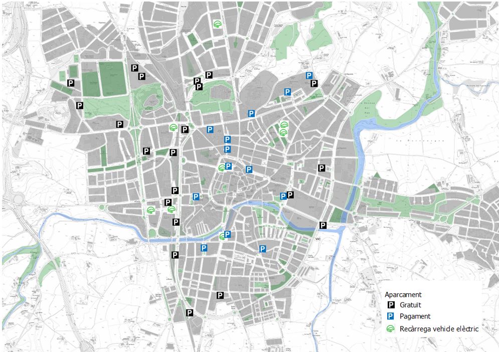 Vic disposa de més de 5.500 places d’aparcament, ja siguin gratuïtes o de pagament, repartides per la ciutat. Totes aquestes bosses d’estacionament estan senyalitzades mitjançant senyalització vertical.