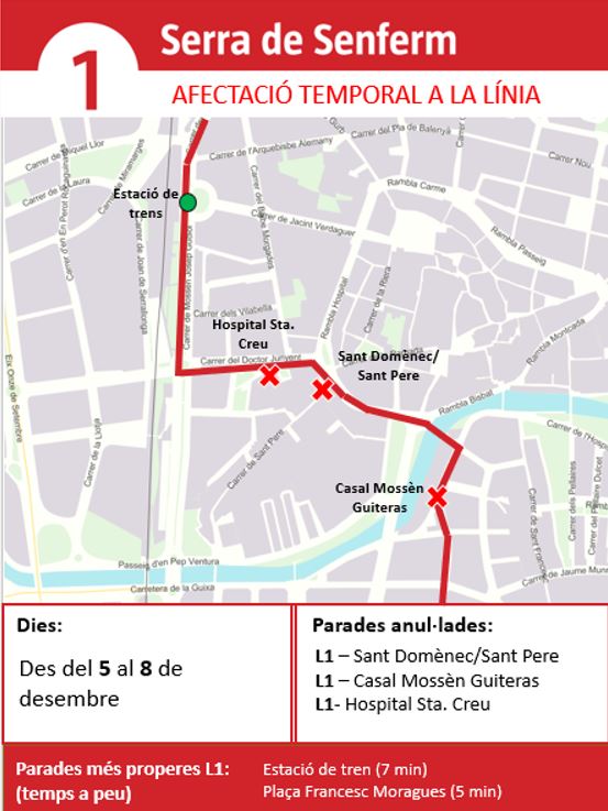 Atès al tancament del c. Dr. Junyent i de la Rambla Sant Domènec, del 5 al 8 de desembre, les parades Sant Domènec/Sant Pere i Casal Mossèn Guiteras quedaran anul·lades.