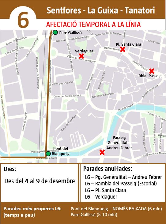 A causa de les restriccions de circulació, al passeig de la Generalitat - rambla del Passeig, del 4 al 9 de desembre, la línia 6 del bus urbà (Sentfores-La Guixa/Tanatori) circularà amb normalitat en la ruta d’anada, tot i que la tornada es farà pel carrer de Mossèn Josep Gudiol. Per tant, no s'aturarà a les parades del passeig de la Generalitat-Andreu Febrer, rambla del Passeig (Escorial), plaça Santa Clara (Pare Coll-Sant Miquel) i Verdaguer.