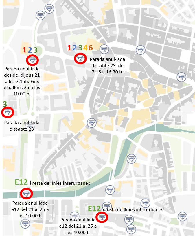 - Del dijous 21 a les 7.15 h fins al dilluns 25 , la parada del bus urbà “Pl. Estació” de la L1, L2 i L3 quedarà anul·lada, i la parada de l’Estació d’Autobusos serà la més propera, situada a 3 minuts a peu.