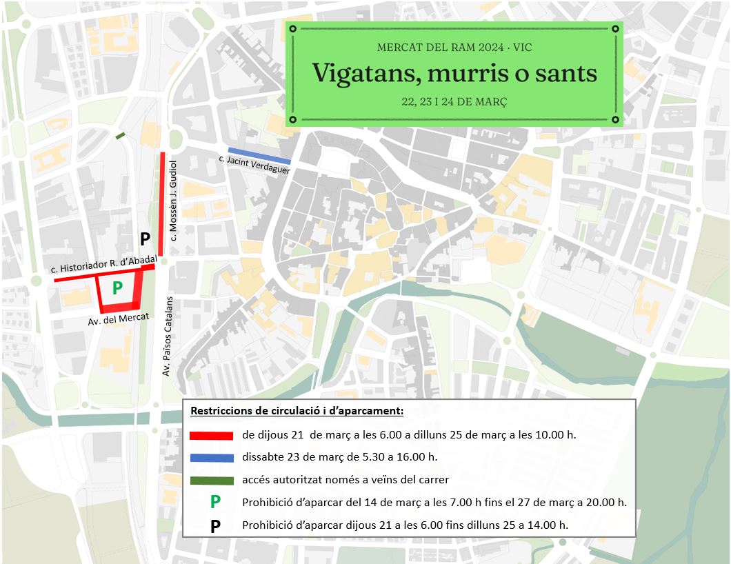 - del 21 al 25 de març s’eliminarà l’aparcament Joan de Serrallonga i els ubicats als vials on la circulació estarà prohibida pel mercat.